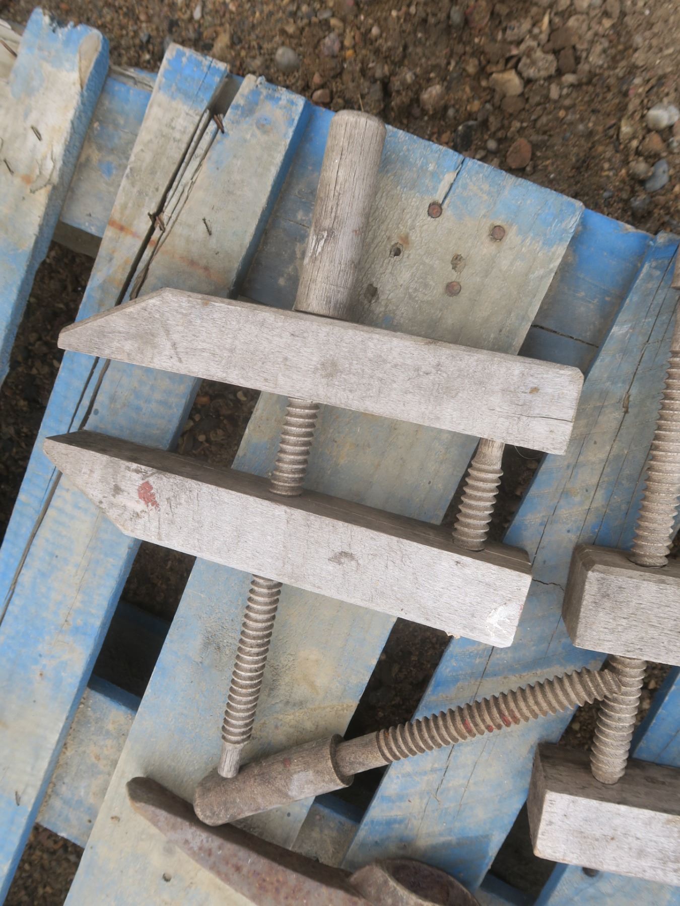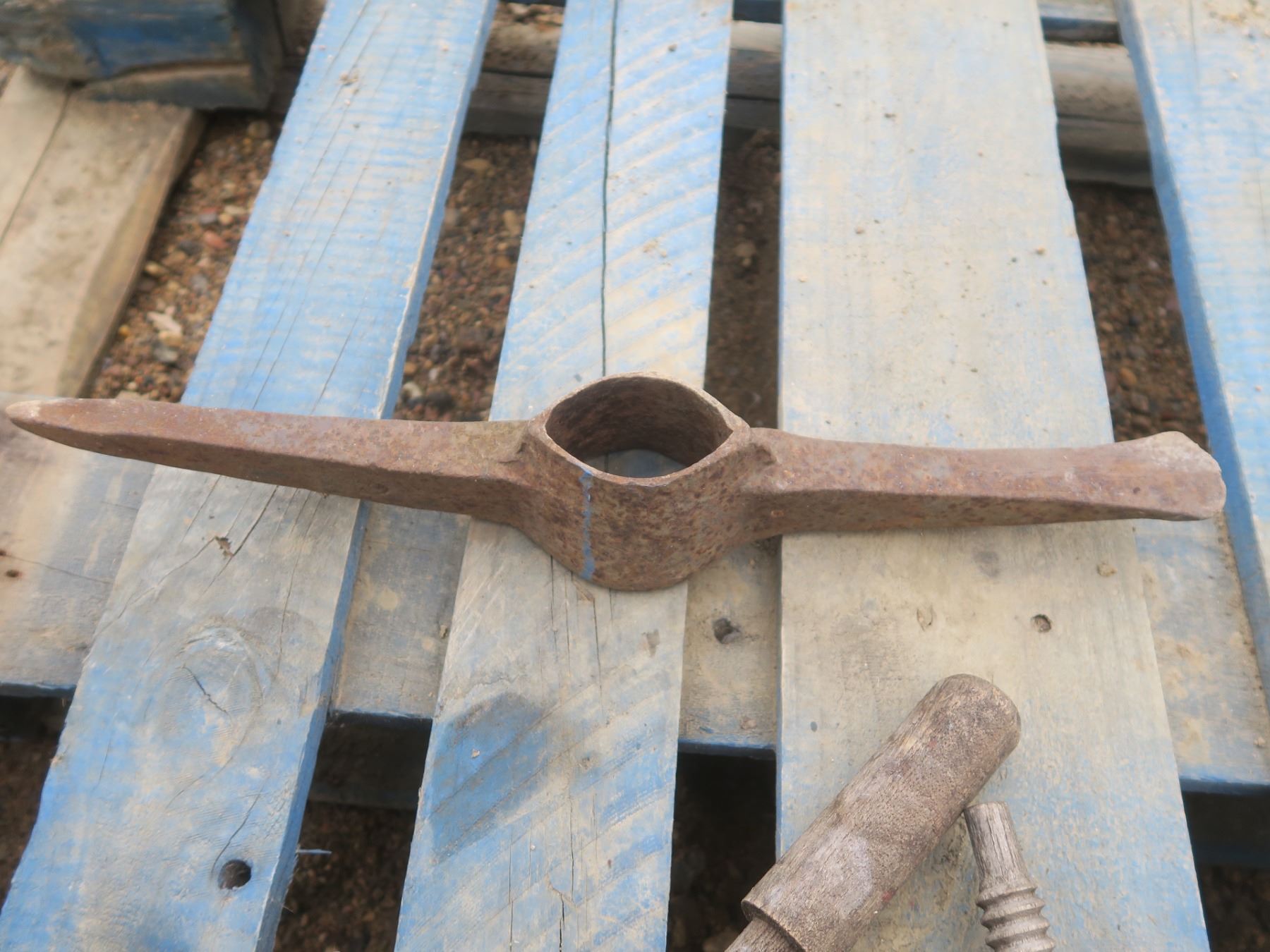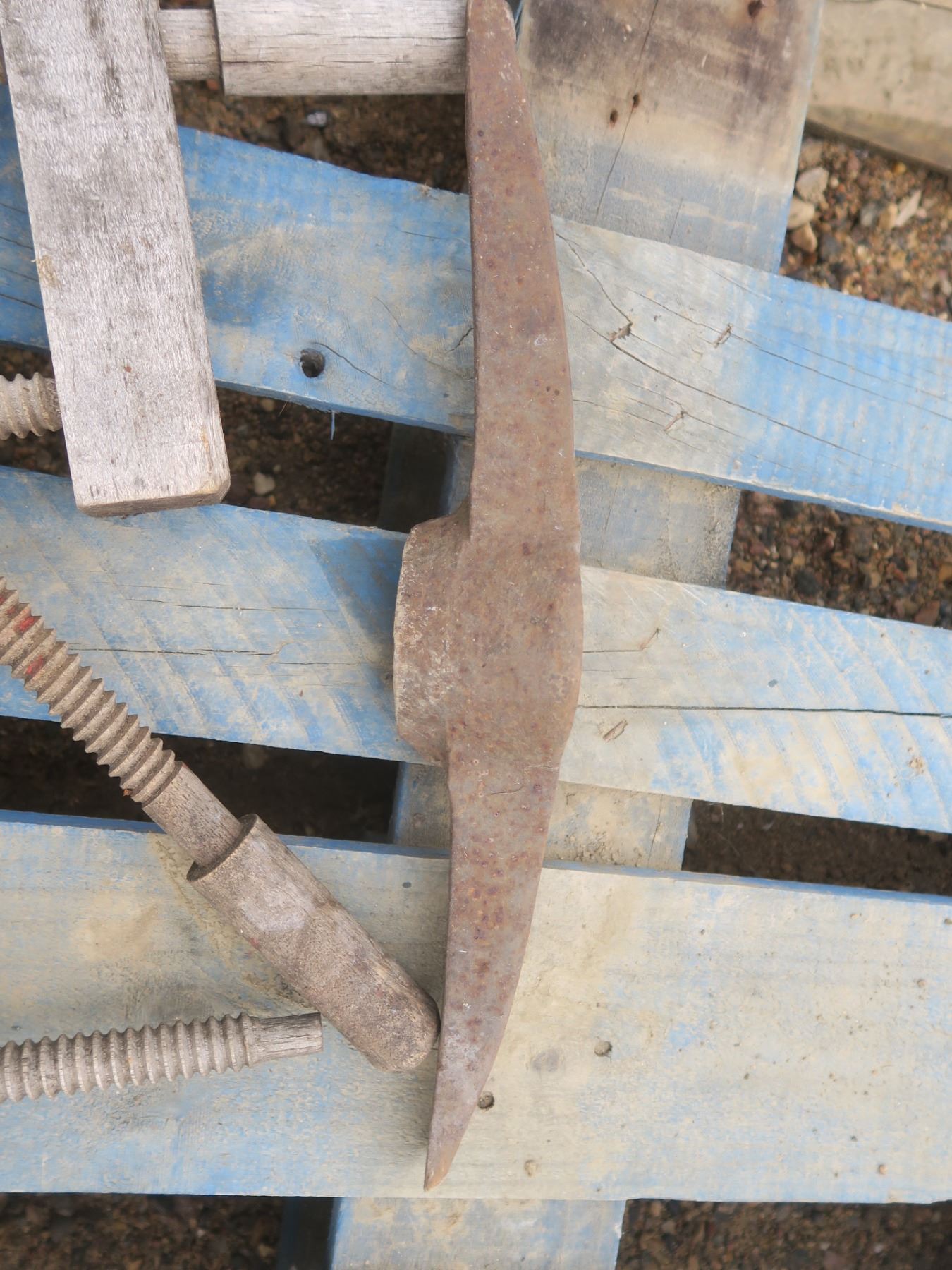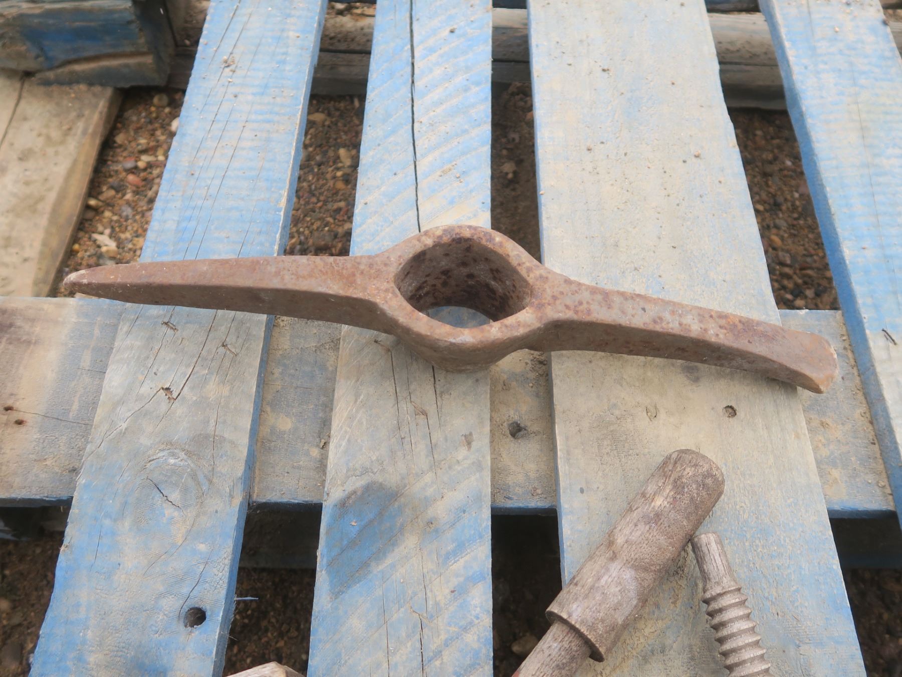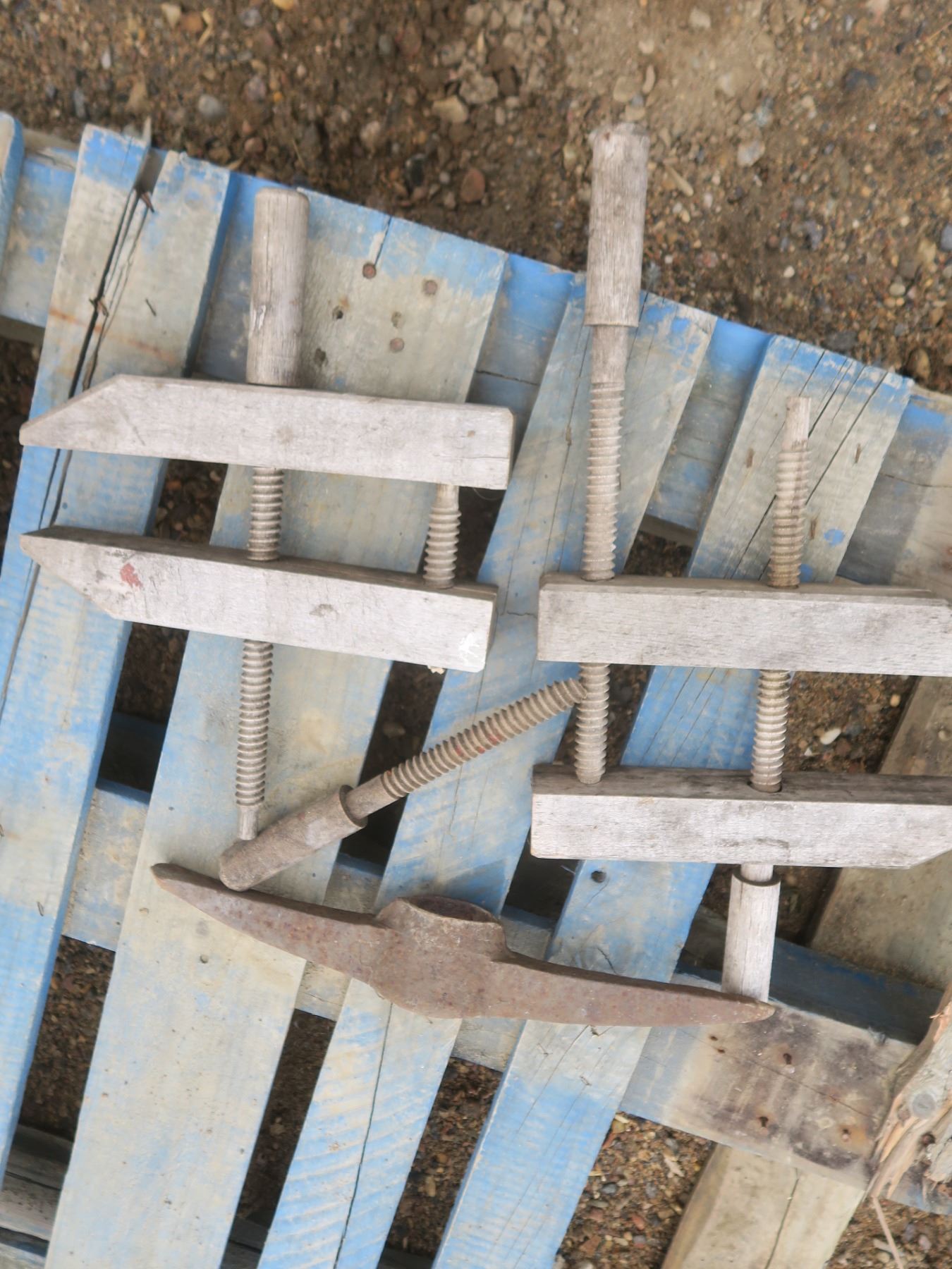 2 vintage wooden clamps (1 broken) and pickaxe head