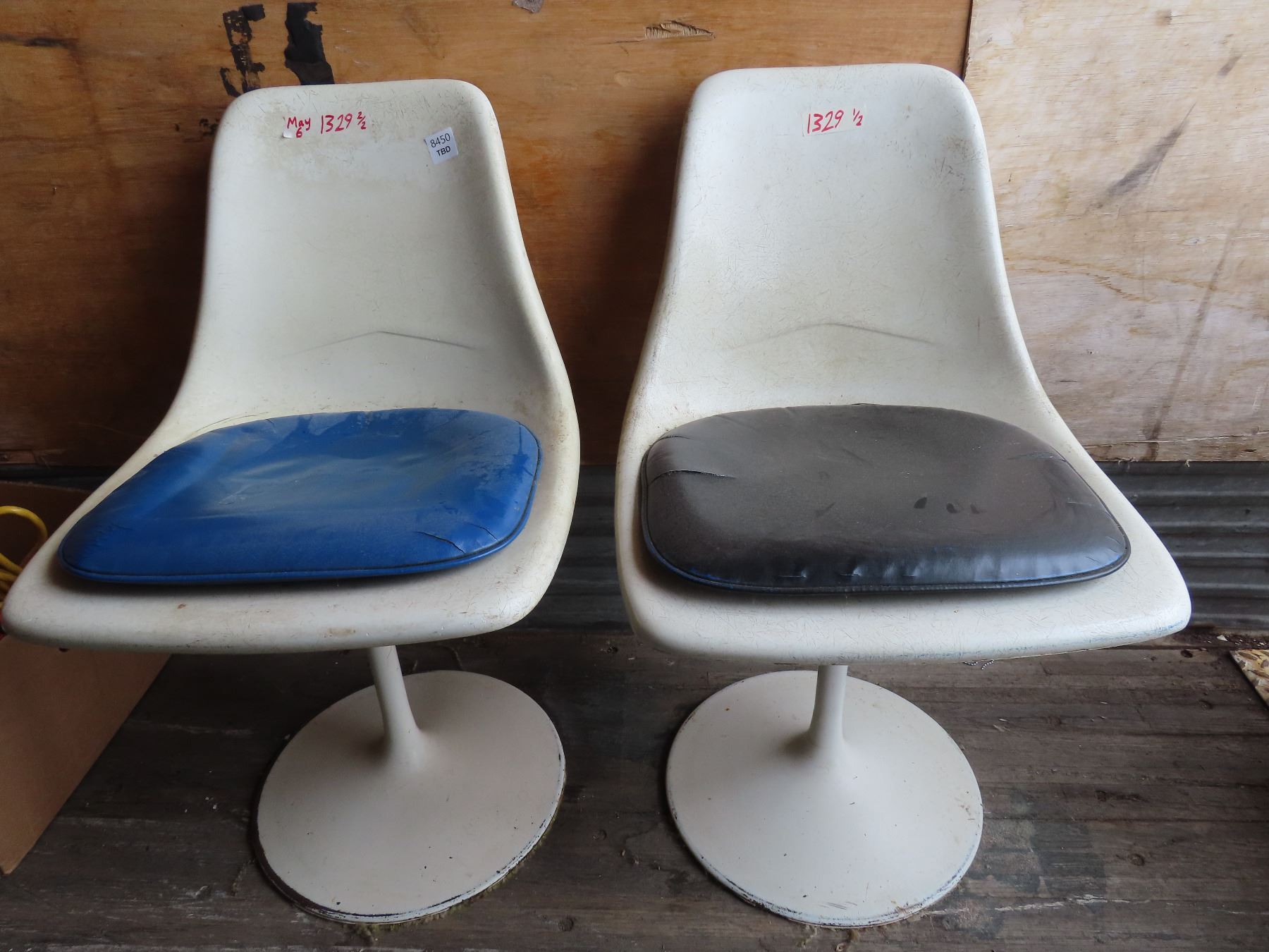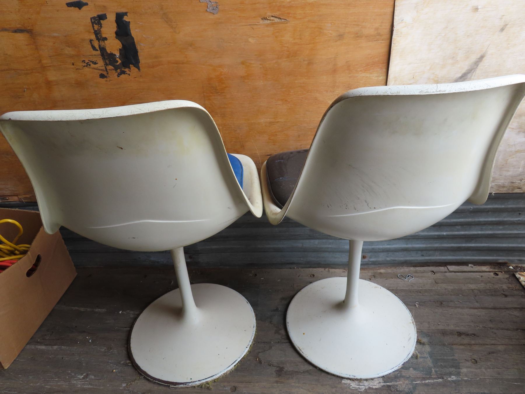 2 white swivel chairs