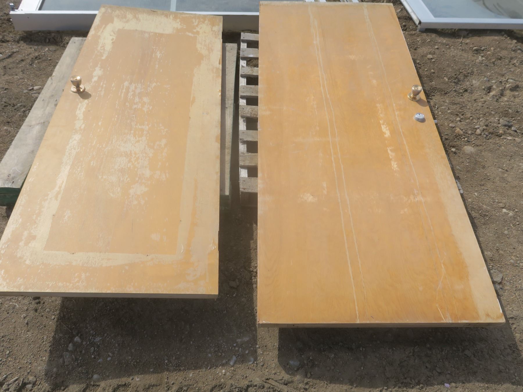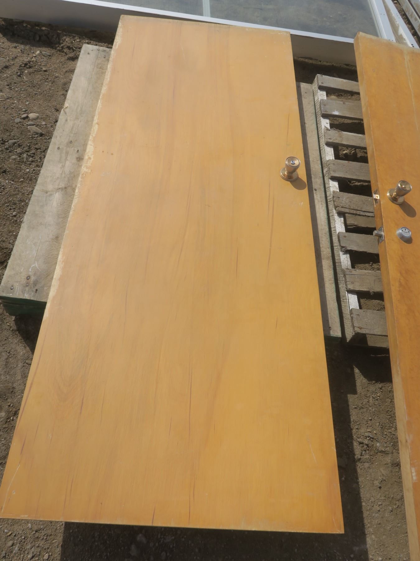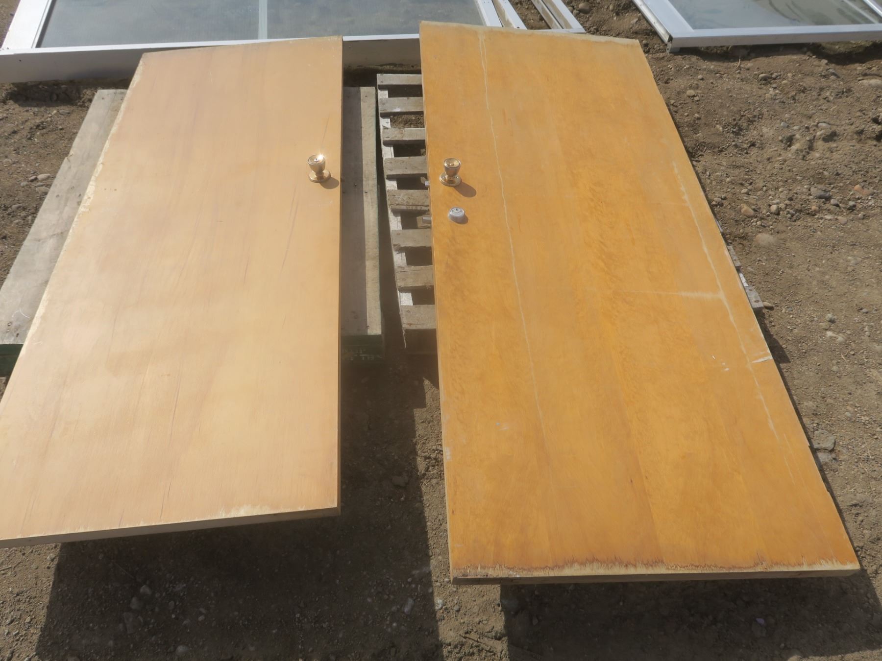 2 wooden doors - with lock:81.75"x33.75"x1.75", and 77.25"x30"x1.5"