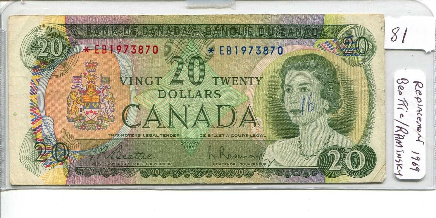 $20.00 1969 Beattie/Rasminsky Replacement est VF twenty dollar bill / note