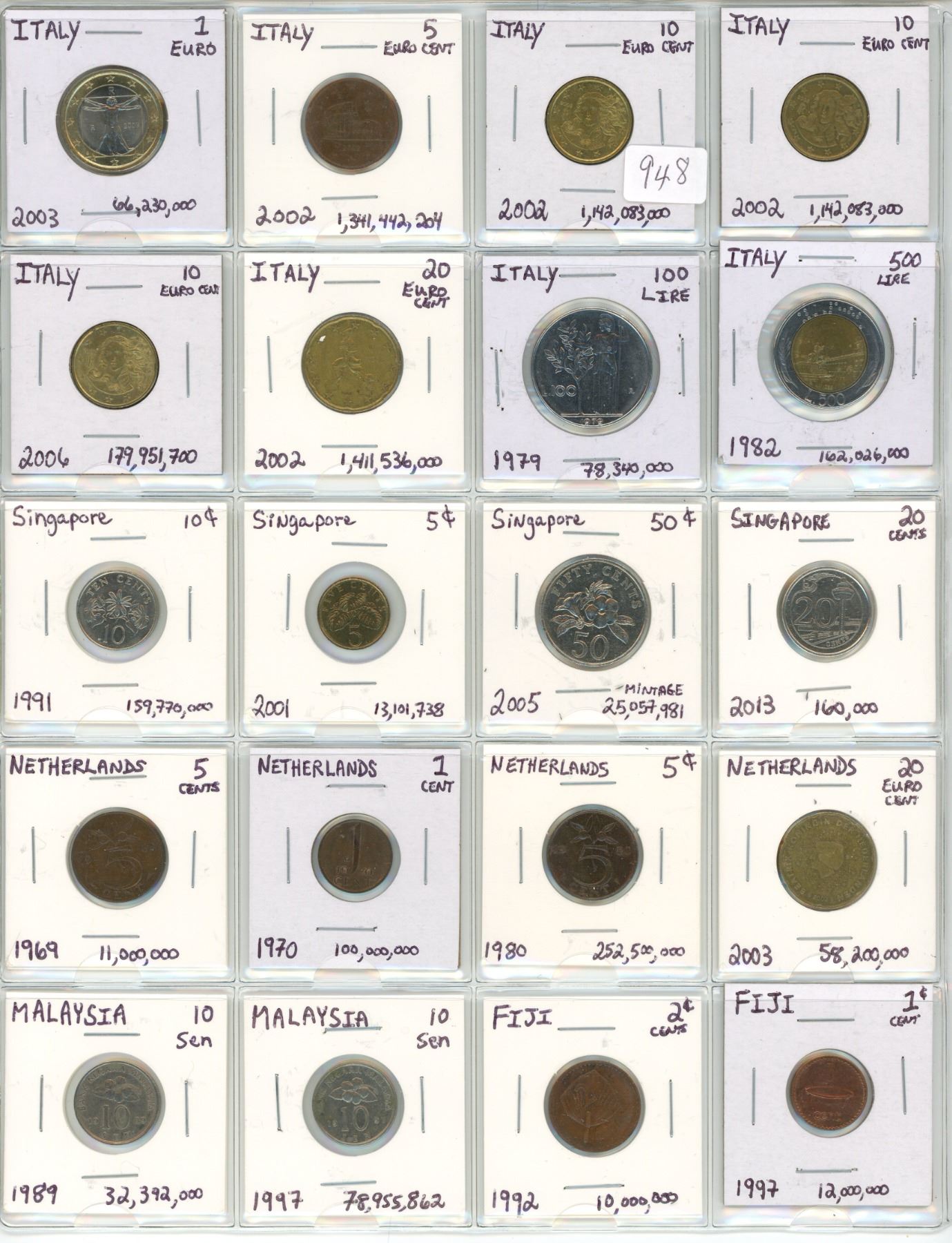 20 Foreign coins - Italian, Signapore, Netherlands, Malaysia, etc.