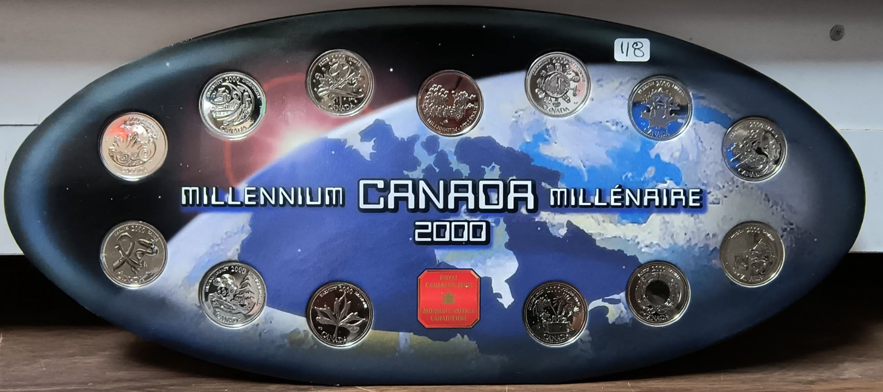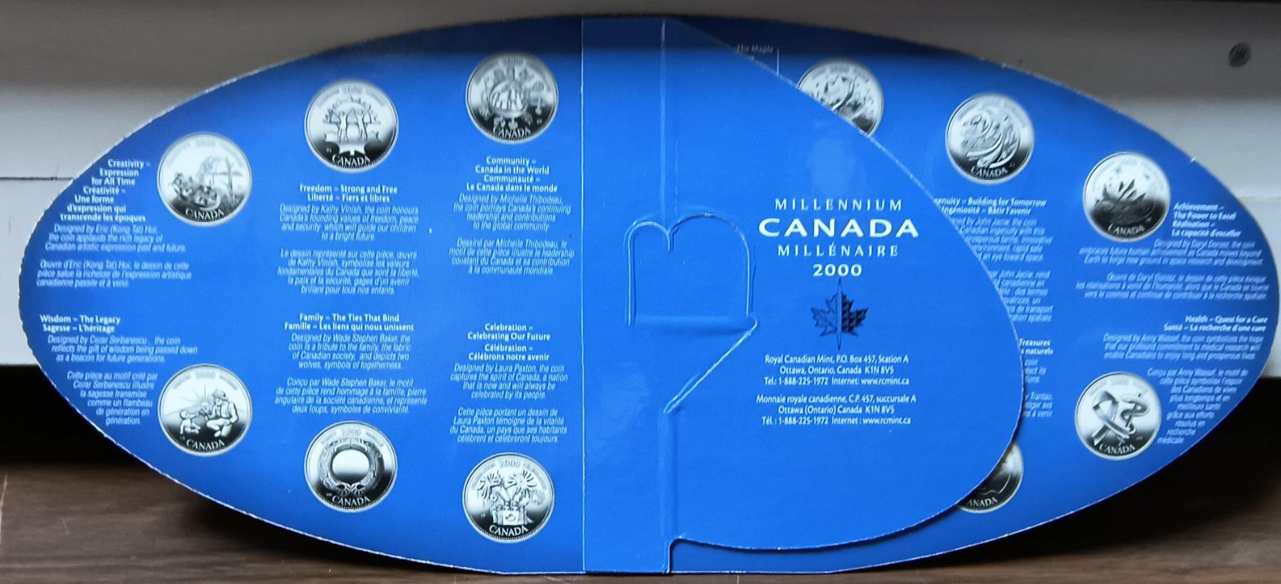2000 Canadian Millennium 25 Cents Set. 12 25 Cents coins, plus one Royal Canadian Mint Medal. Housed in its original Royal Canadian Mint packaging that depicts a map of Canada.
