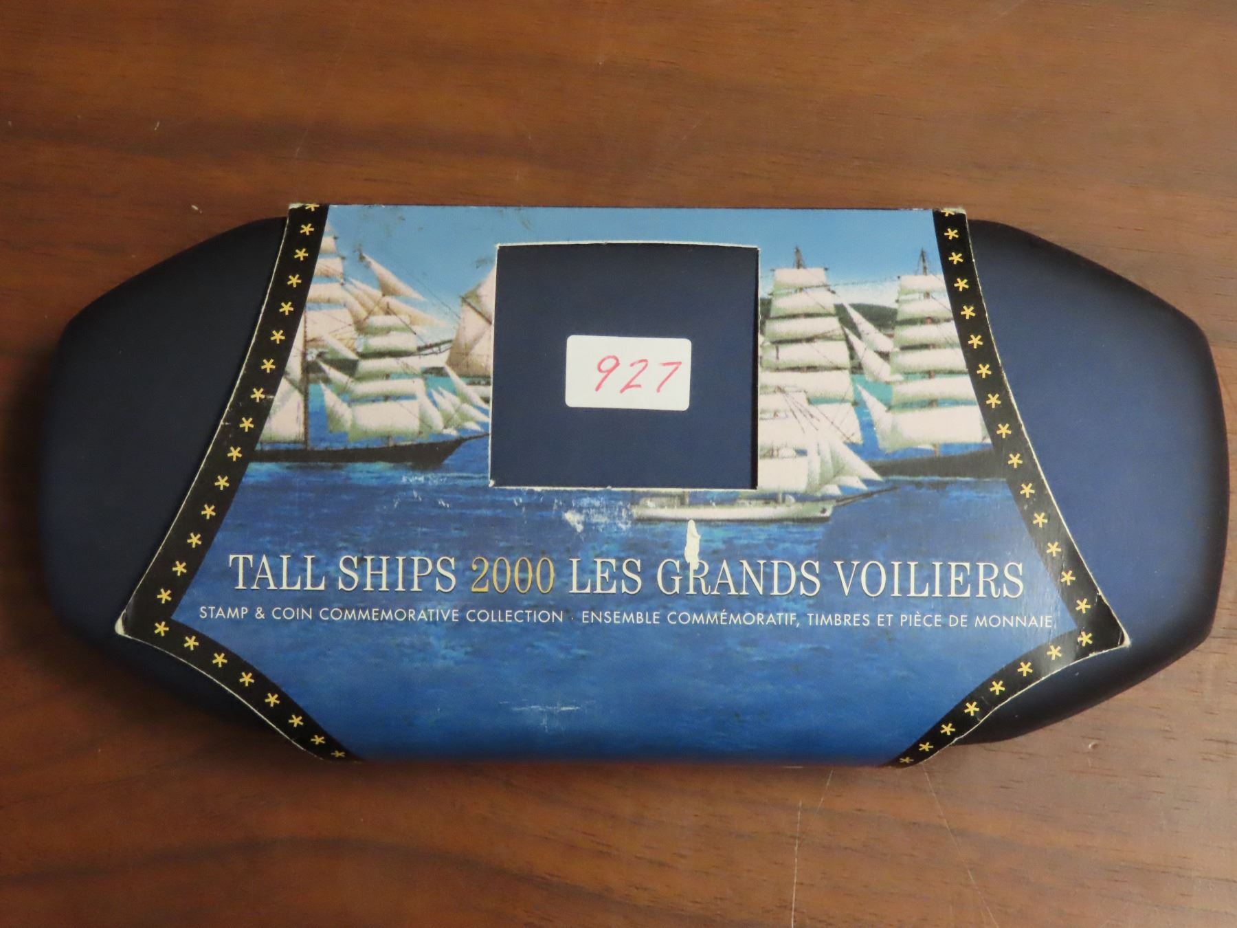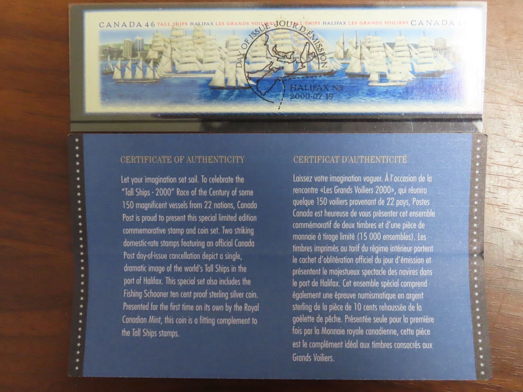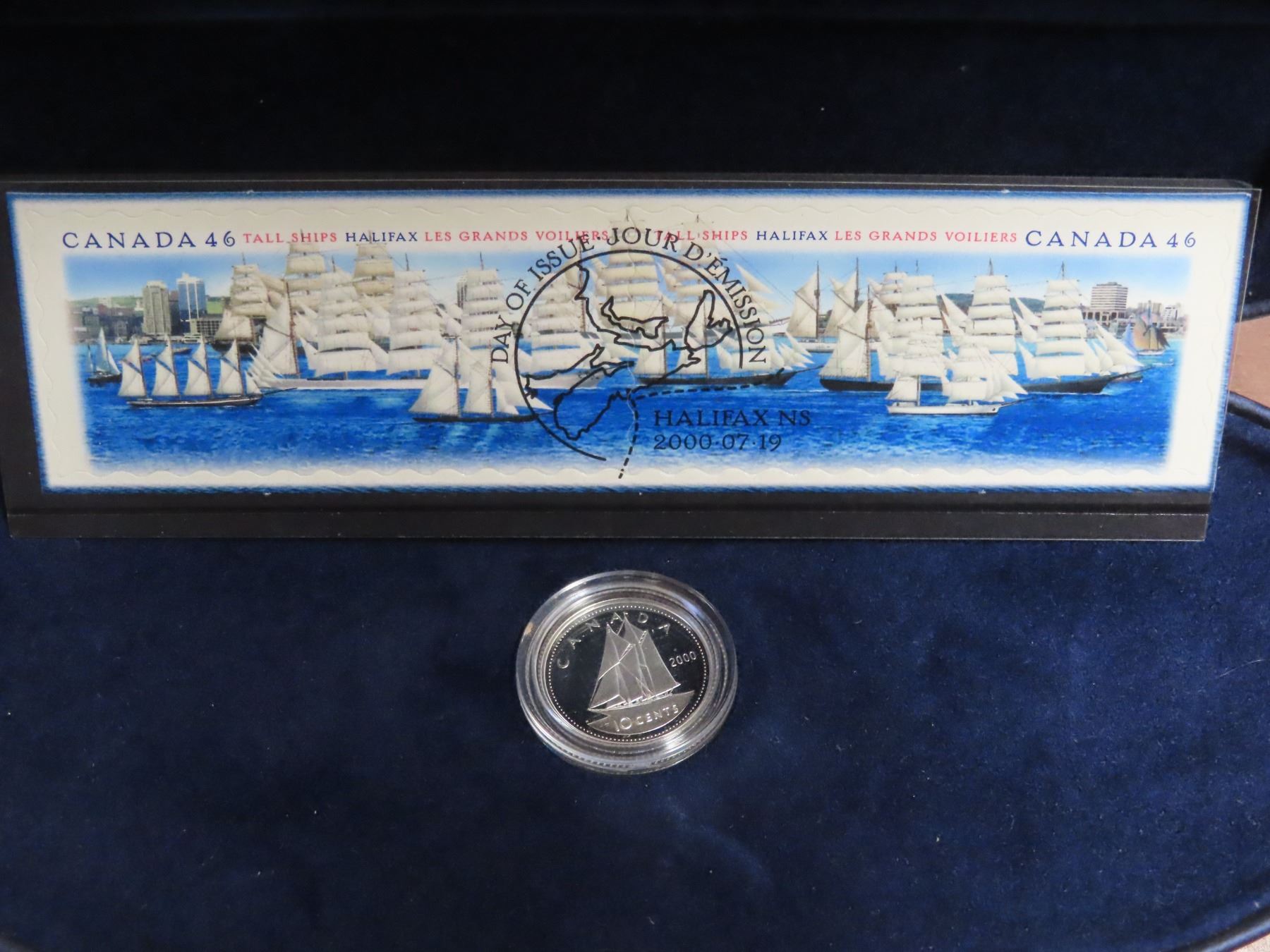 2000 Tall Ships Silver 10 Cents Coin & Stamp Collection. Proof Sterling Silver Bluenose 10 Cents with Ultra Heavy Cameo. Also includes two 46-Cent stamps that depict the world’s Tallest Ships in Halifax Harbour. Stamps are Cancelled First Day of Issue. Housed in its original case of issue.