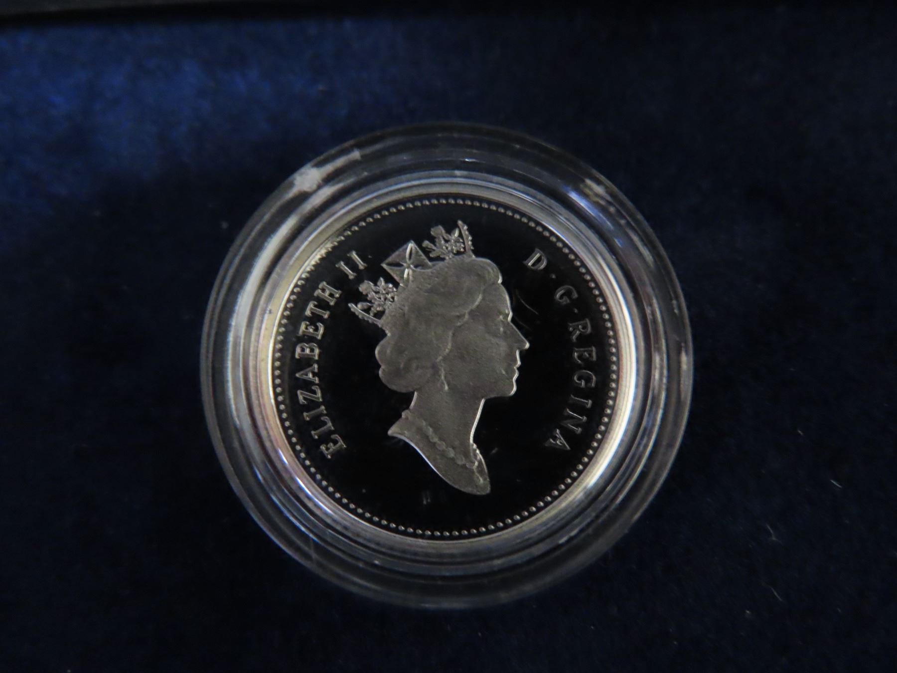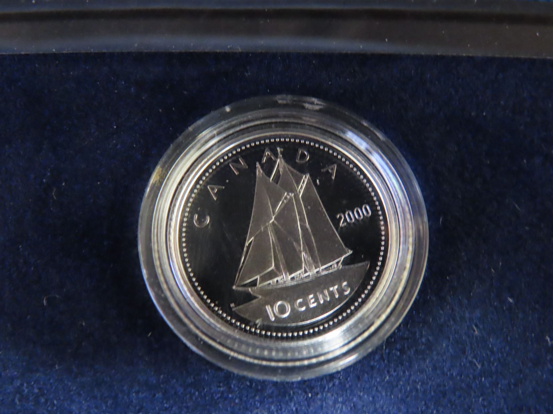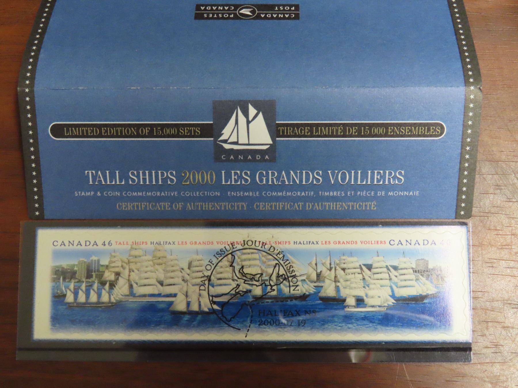 2000 Tall Ships Silver 10 Cents Coin & Stamp Collection. Proof Sterling Silver Bluenose 10 Cents with Ultra Heavy Cameo. Also includes two 46-Cent stamps that depict the world’s Tallest Ships in Halifax Harbour. Stamps are Cancelled First Day of Issue. Housed in its original case of issue.