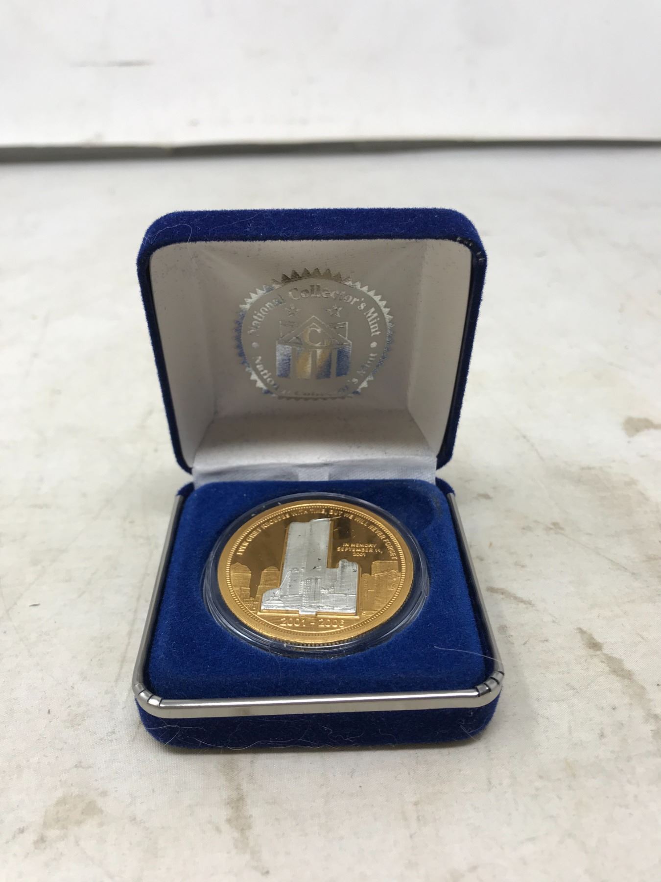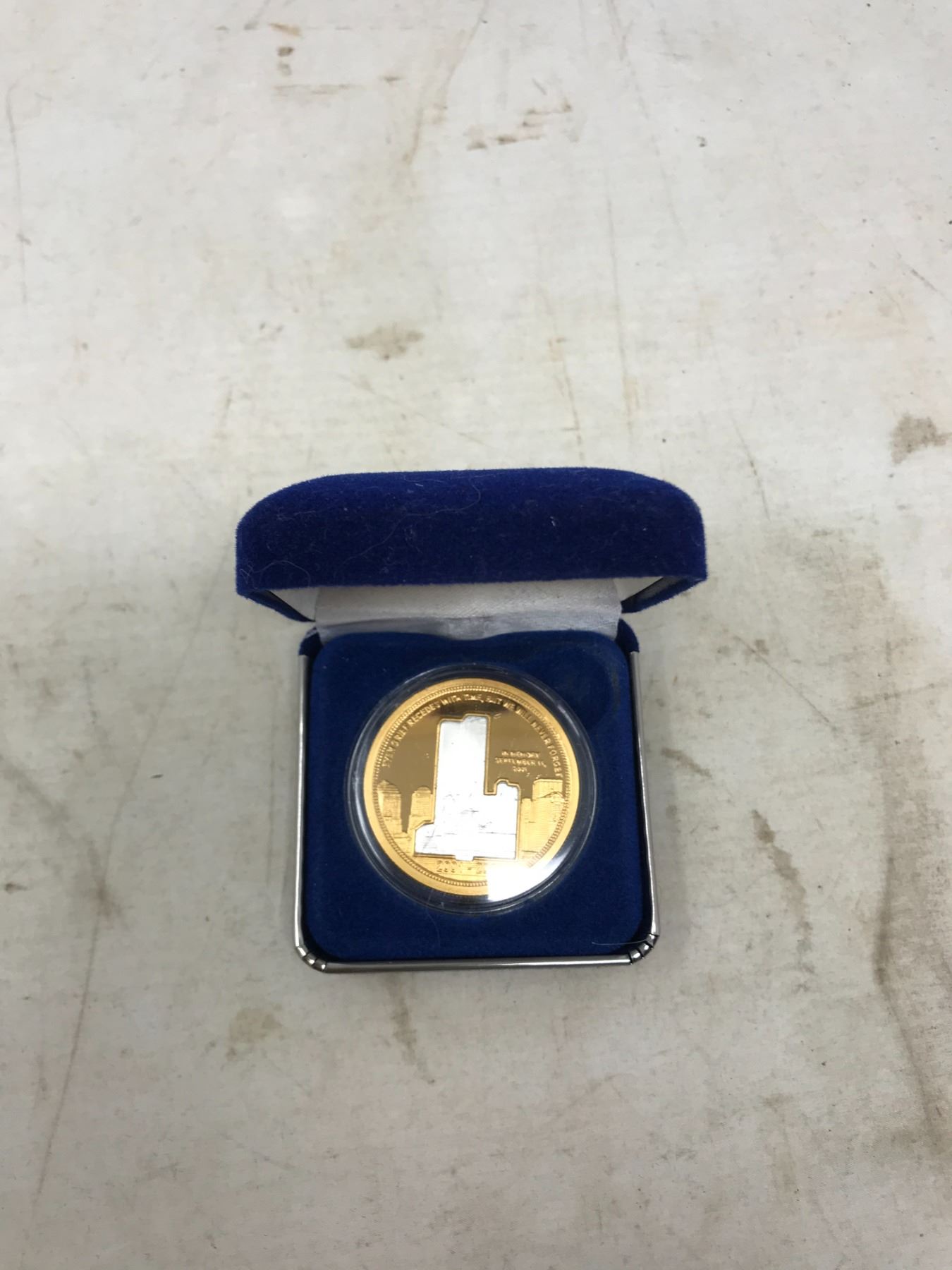 2001-2006 WORLD TRADE CENTRE COMMEMORATIVE. FEATURES STANDING SCULPTURE OF THE TWIN TOWERS CLAD IN .999 PURE SILVER RECOVERED FROM GROUND ZERO. CLAD IN 24 KARAT GOLD. HOUSED IN A CUSTOM CASE OF ISSUE. PROOF.
