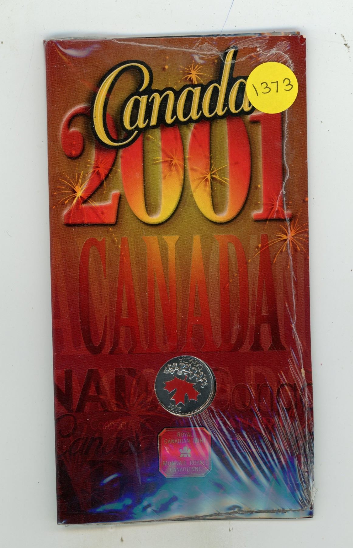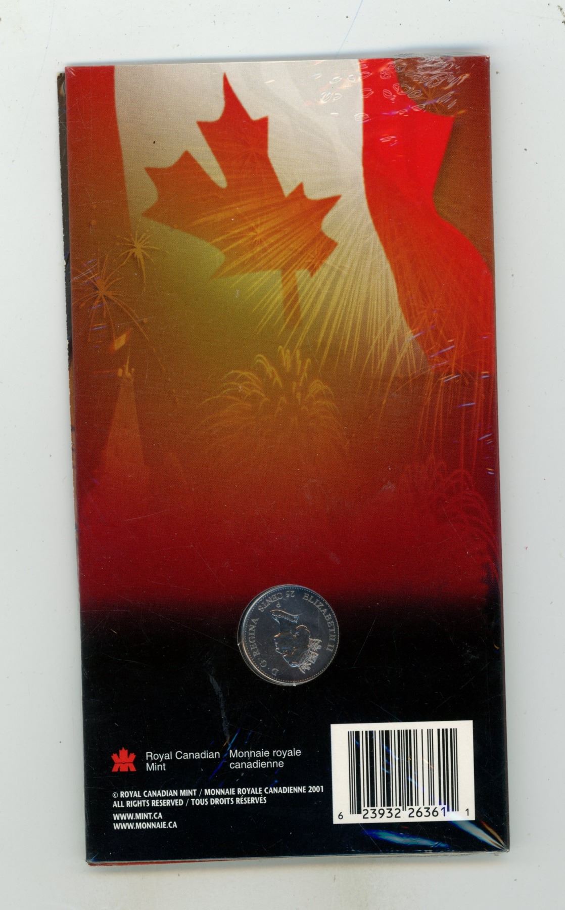 2001 Colourized Canada Day 25 Cents with Red Maple Leaf. Housed in its original and unopened Royal Canadian folder.