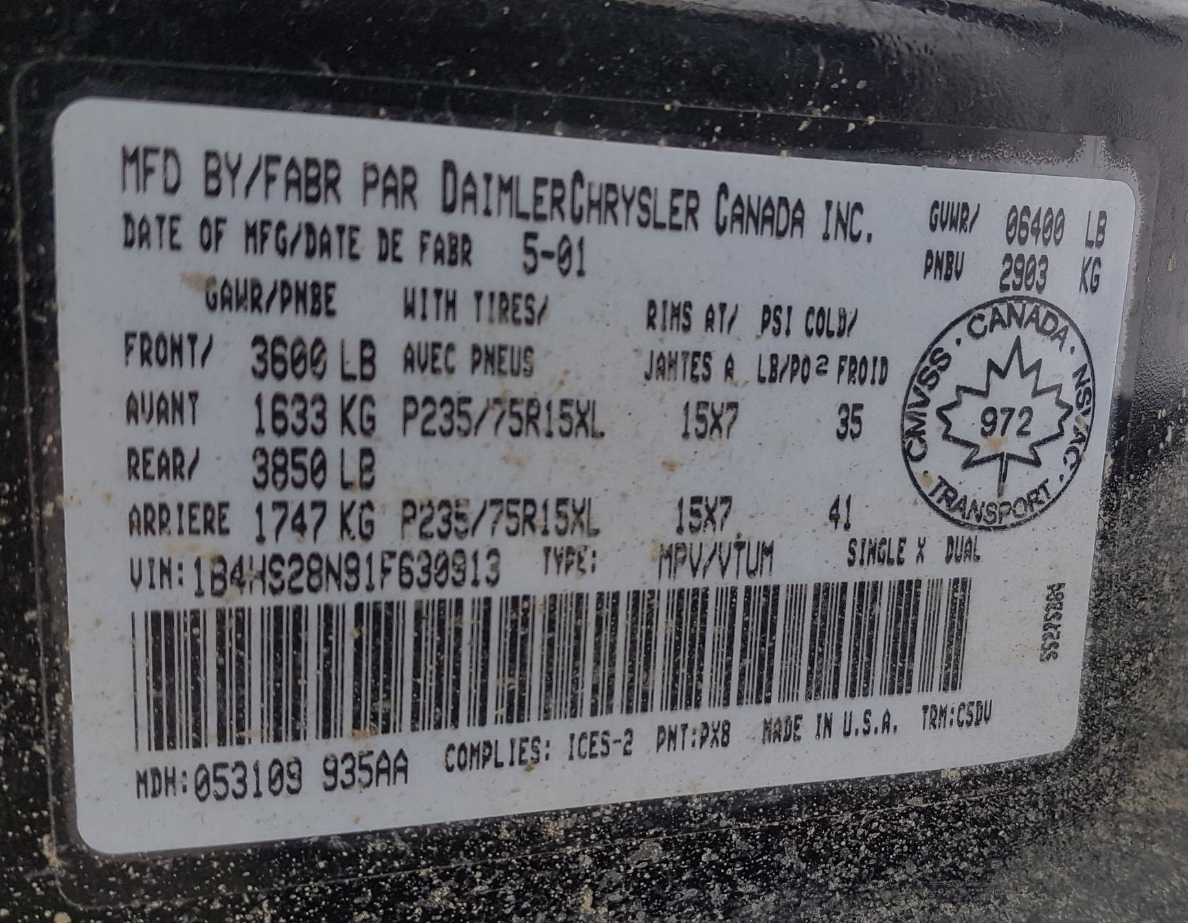2001 Dodge Durango 4WD 1B4HS28N91F630913 (No Keys)