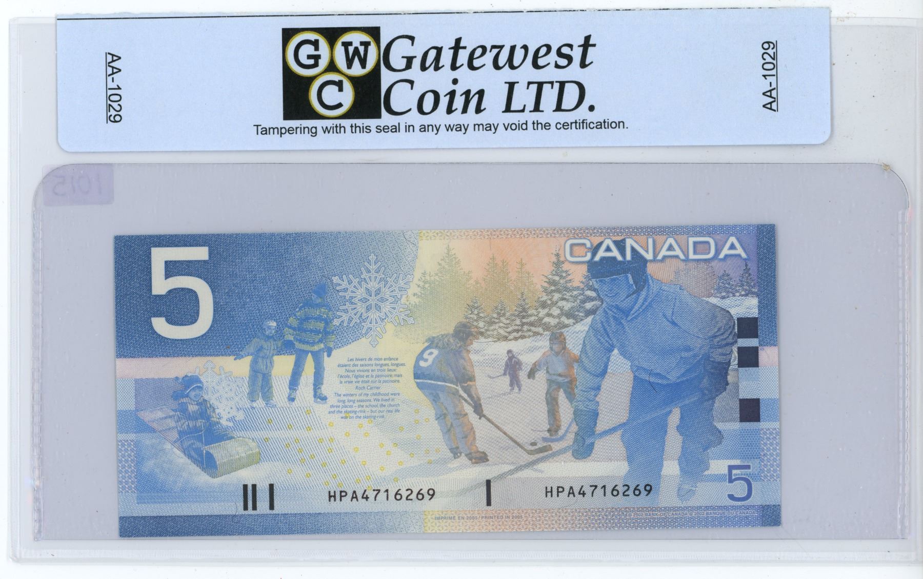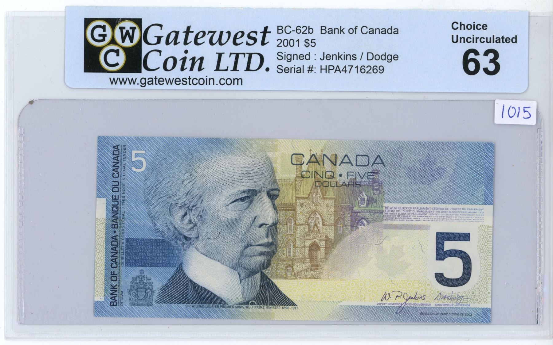 2001 Graded Canadian 5 dollar bill - Jenkins/Dodge - Prefix HPA 4716269 - GWC-UNC 63
