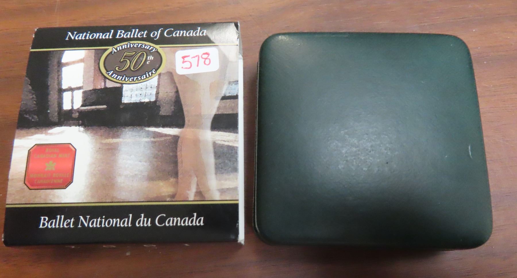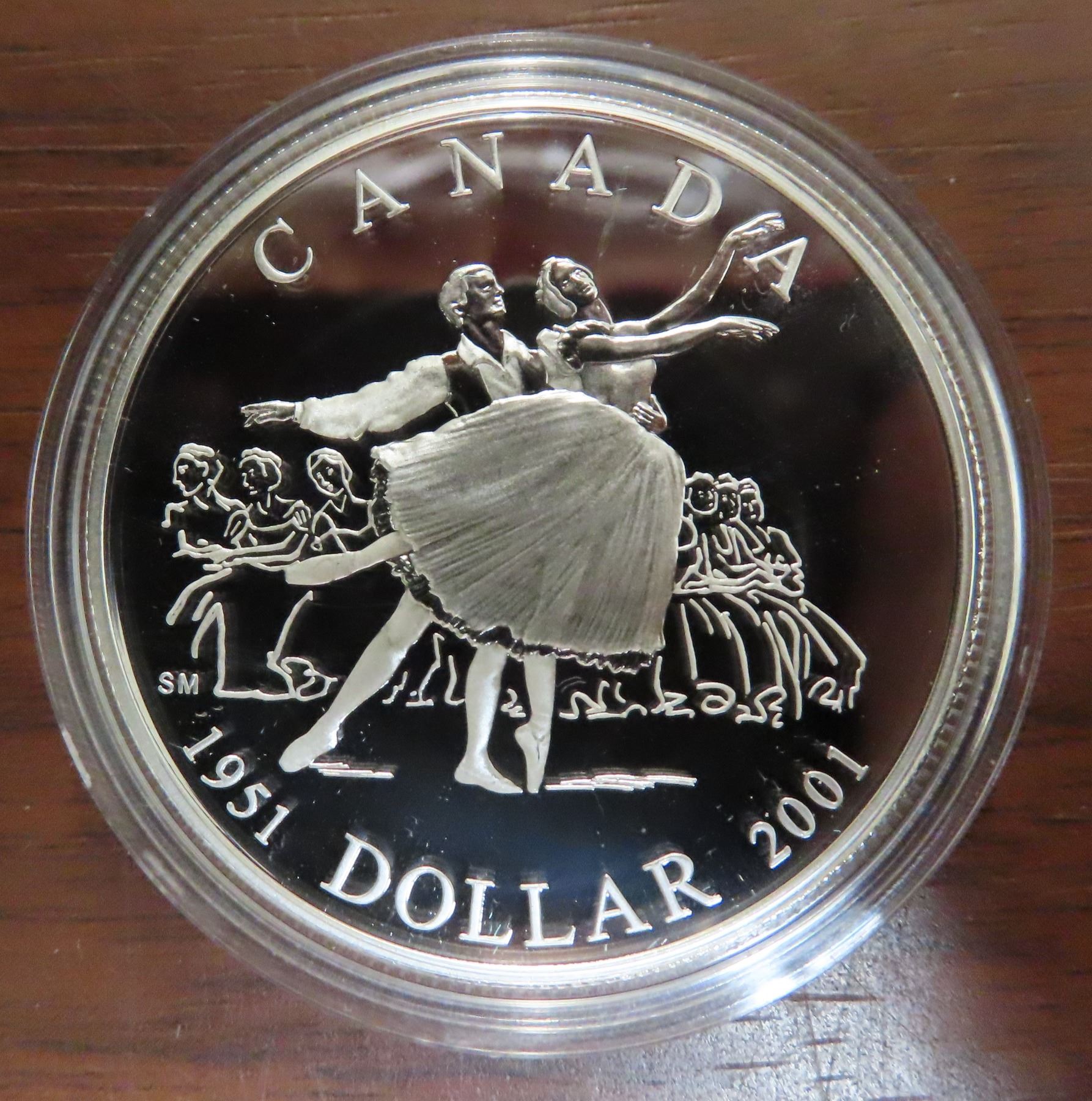 2001 Proof Silver Dollar. 50th Anniversary of the National Ballet of Canada. Housed in its original Royal Canadian Mint case of issue. Bright White.