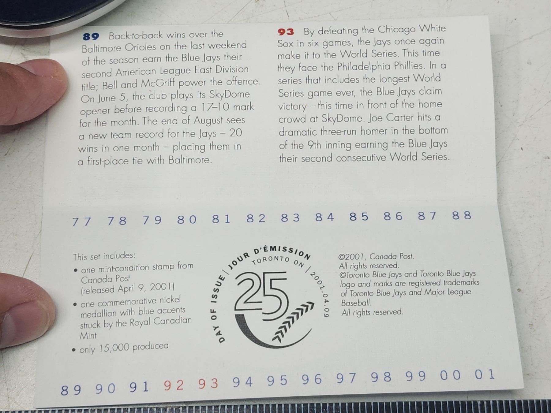 2001 Toronto Blue Jays 25th season stamp & medallion set
