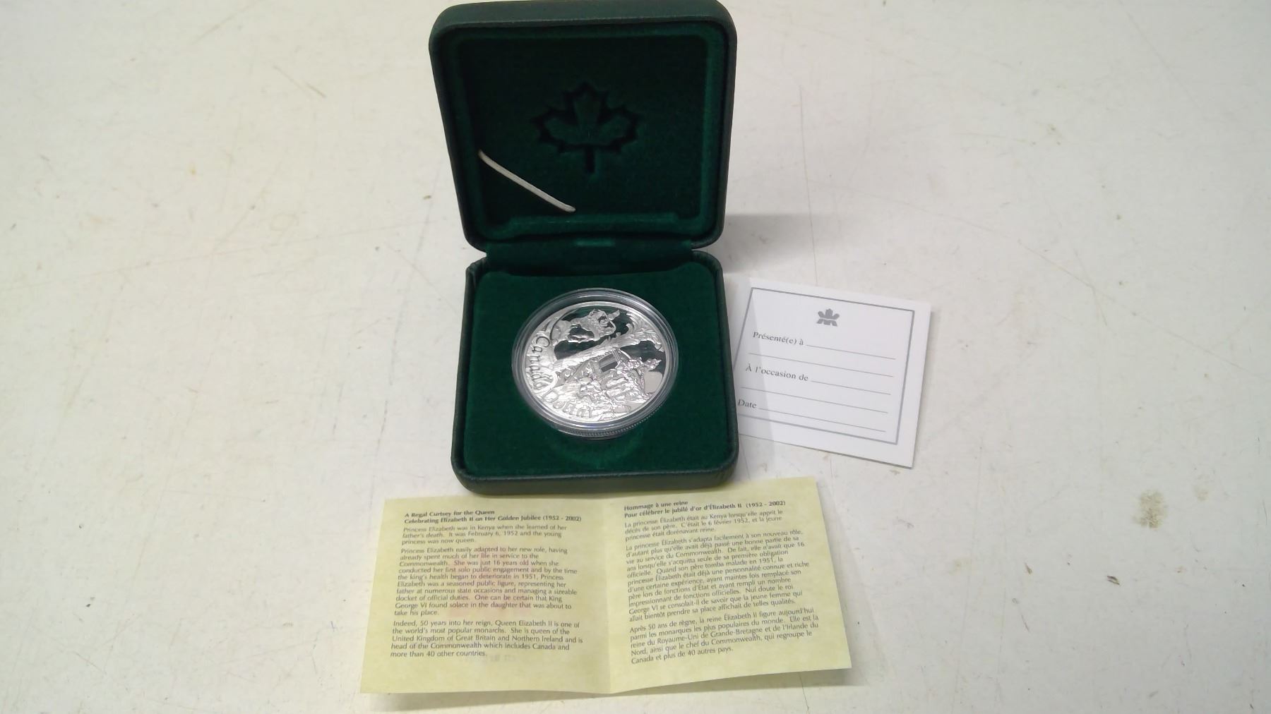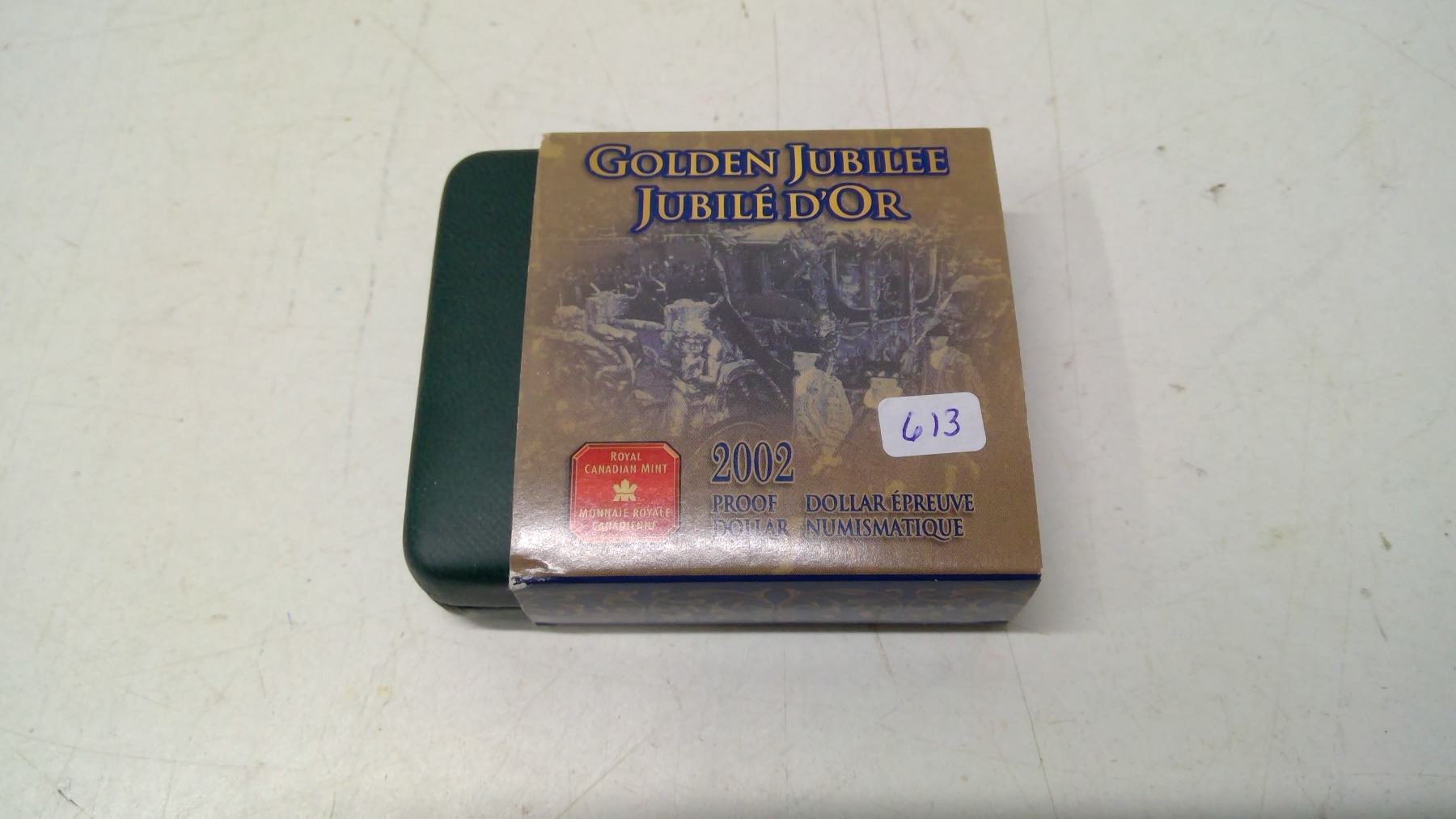 2002 Golden Jubilee of Queen Elizabeth Canadian Silver Dollar. Sterling Silver. Proof with Ultra Heavy Cameo. Housed in its original Royal Canadian Mint case of issue. Includes Certificate of Authenticity.