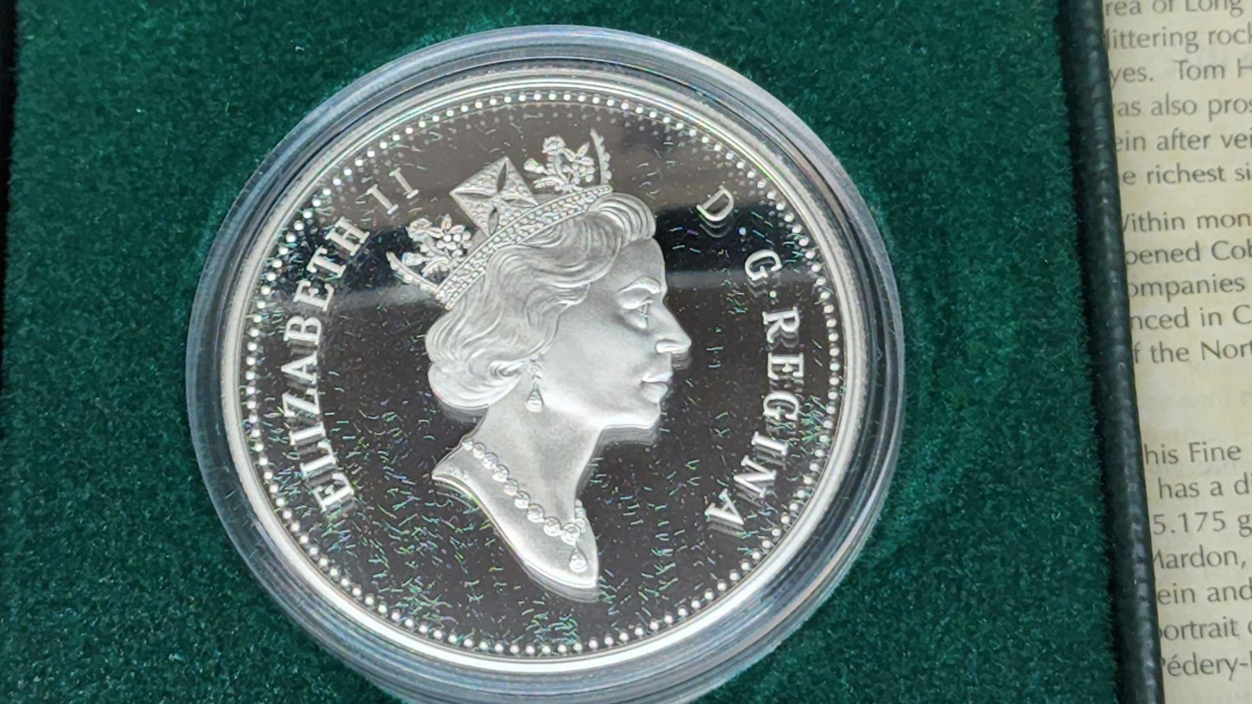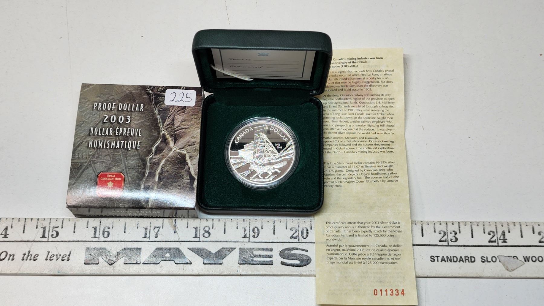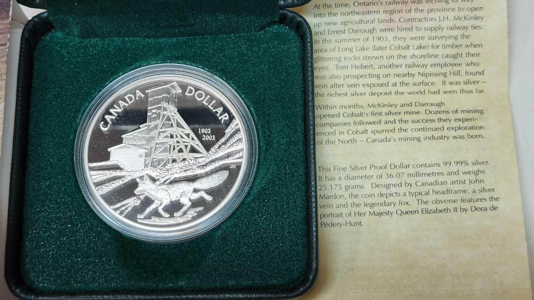 2003 Cobalt Proof Silver Dollar. 100th Anniversary of a blacksmith throwing a hammer at a fox (missing the fox but hitting a vein of silver). Bright White with Ultra Heavy Cameo. Housed in its original case & box of issue.