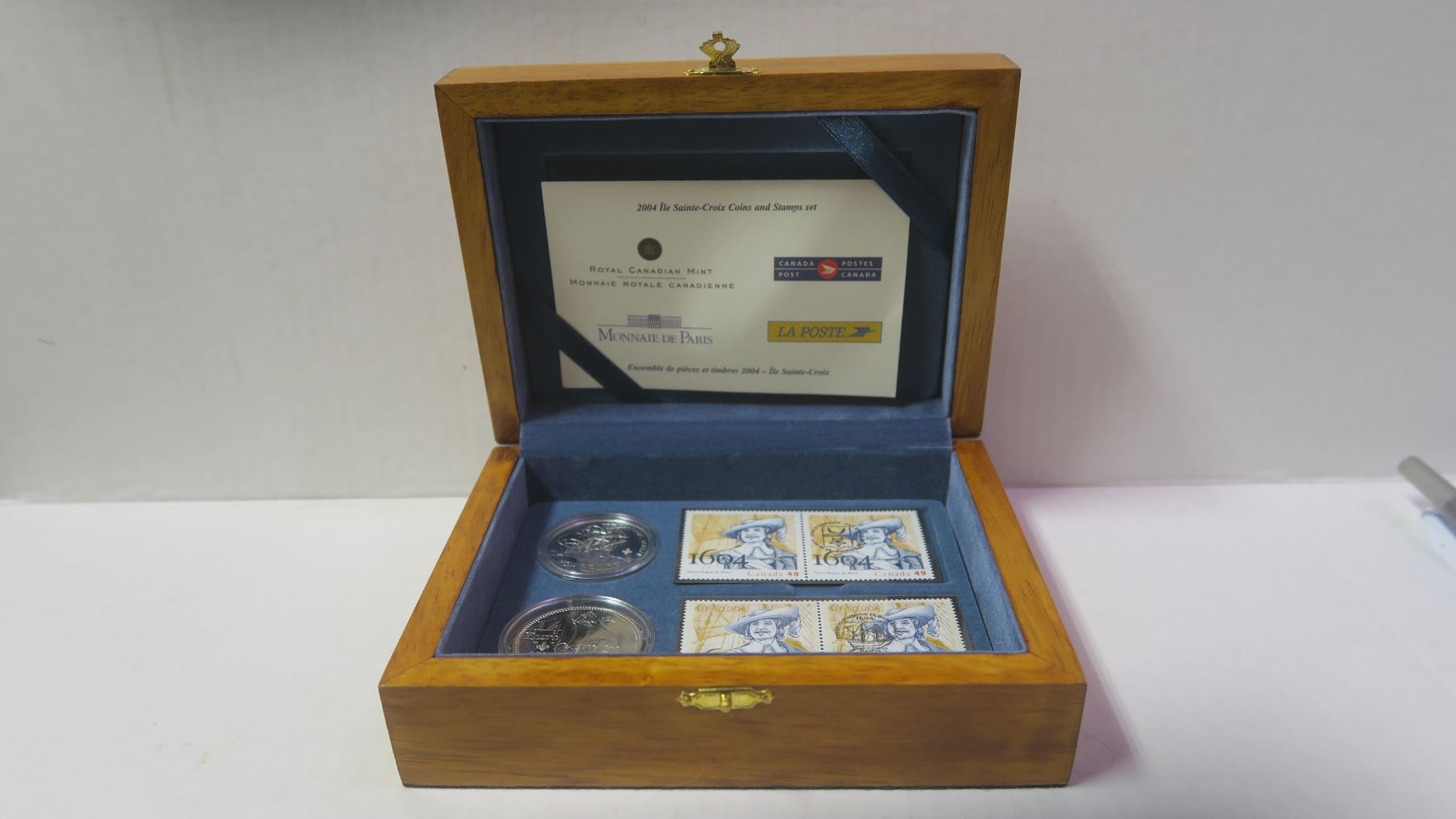 2004 400th Anniversary of the First French Settlement in North America Coins & Stamps Set. The 99.99% pure Silver Dollar has a special Privy Mark plus a French ¼ Euro that is 90% Silver. Includes 4 stamps: 2 from Canada and 2 from France. Housed in a special wooden box of issue. Only 8,315 sets issued.