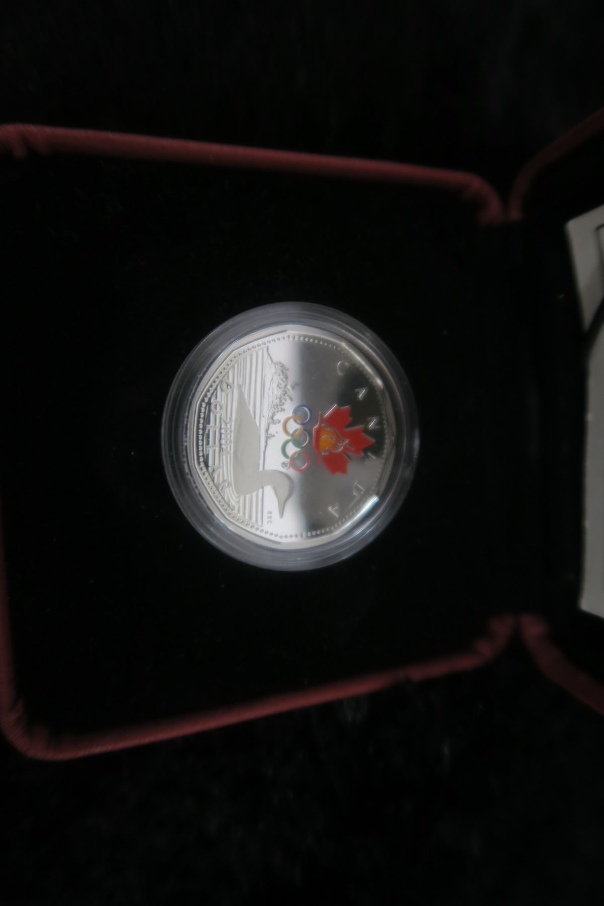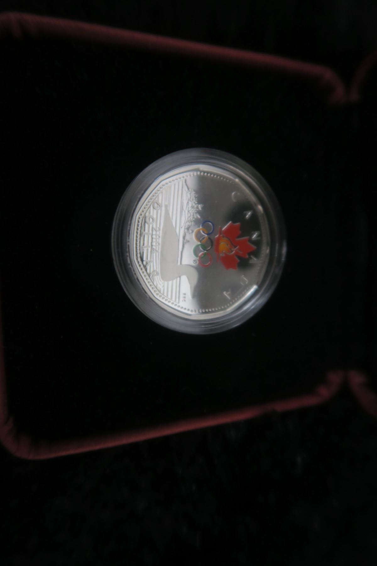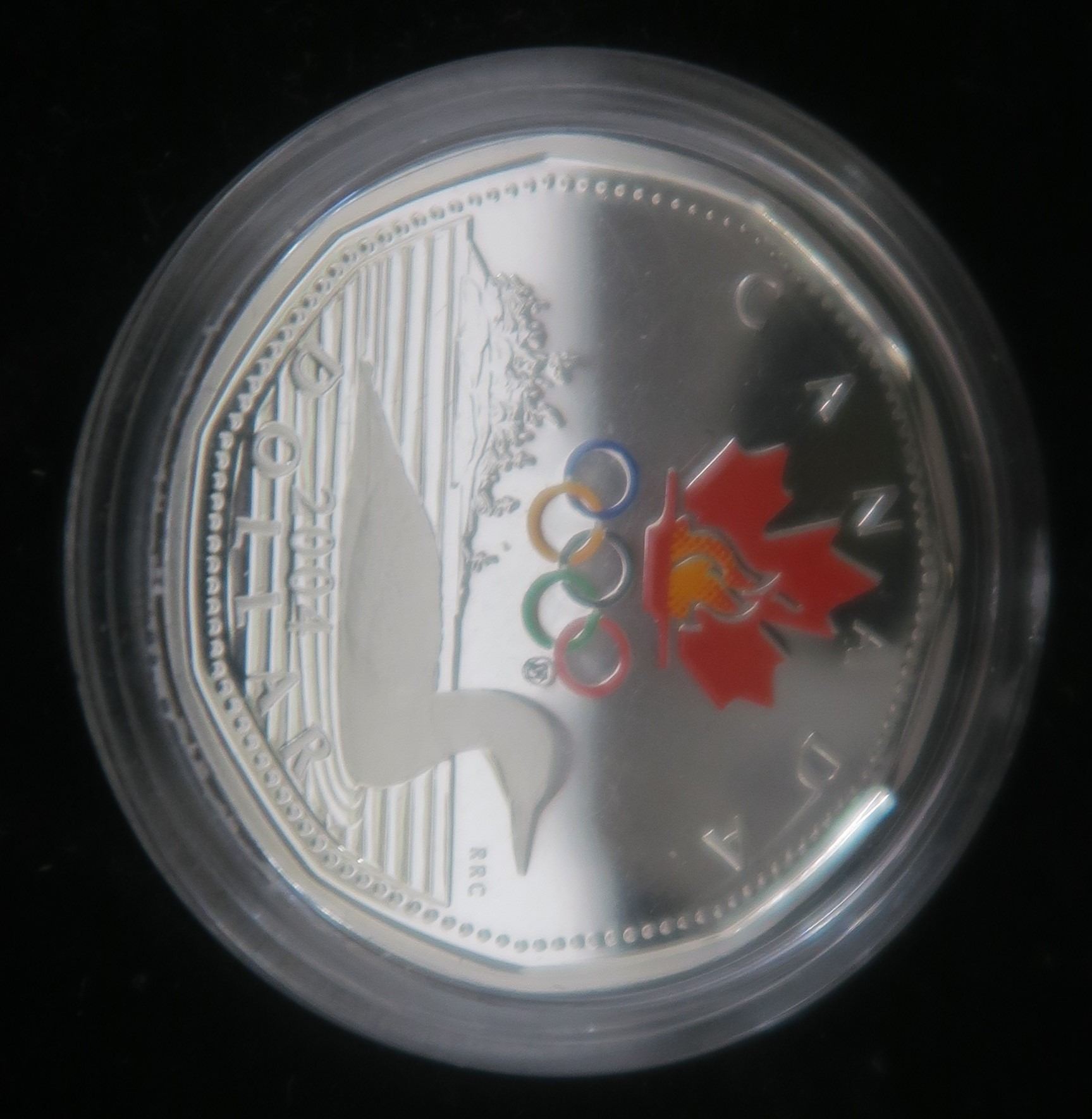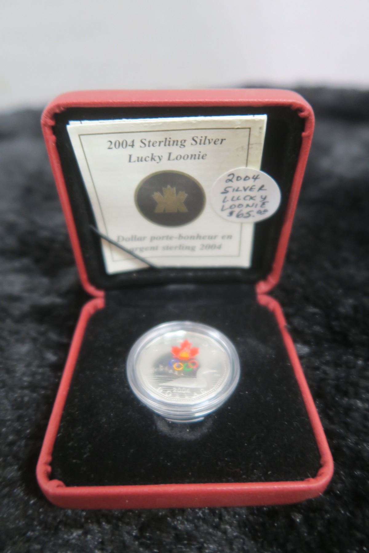 2004 Lucky Loonie Silver Dollar. A Lucky Loonie was secretly buried under the ice at the Salt Lake City Olympics, where Canada’s men’s and women’s hockey teams won gold medals. Sterling Silver with Painted Red Maple Leaf and Olympic Symbols. Proof. Includes COA and case.