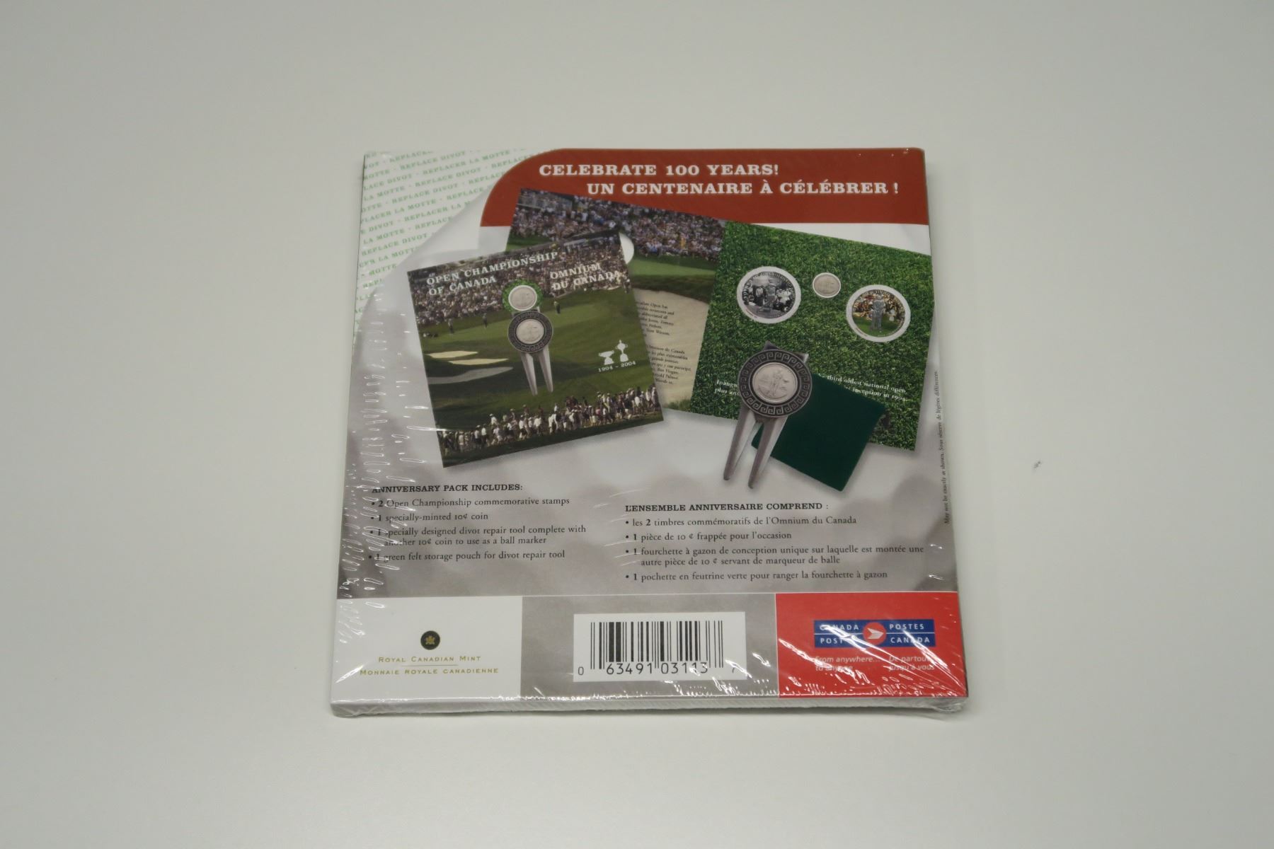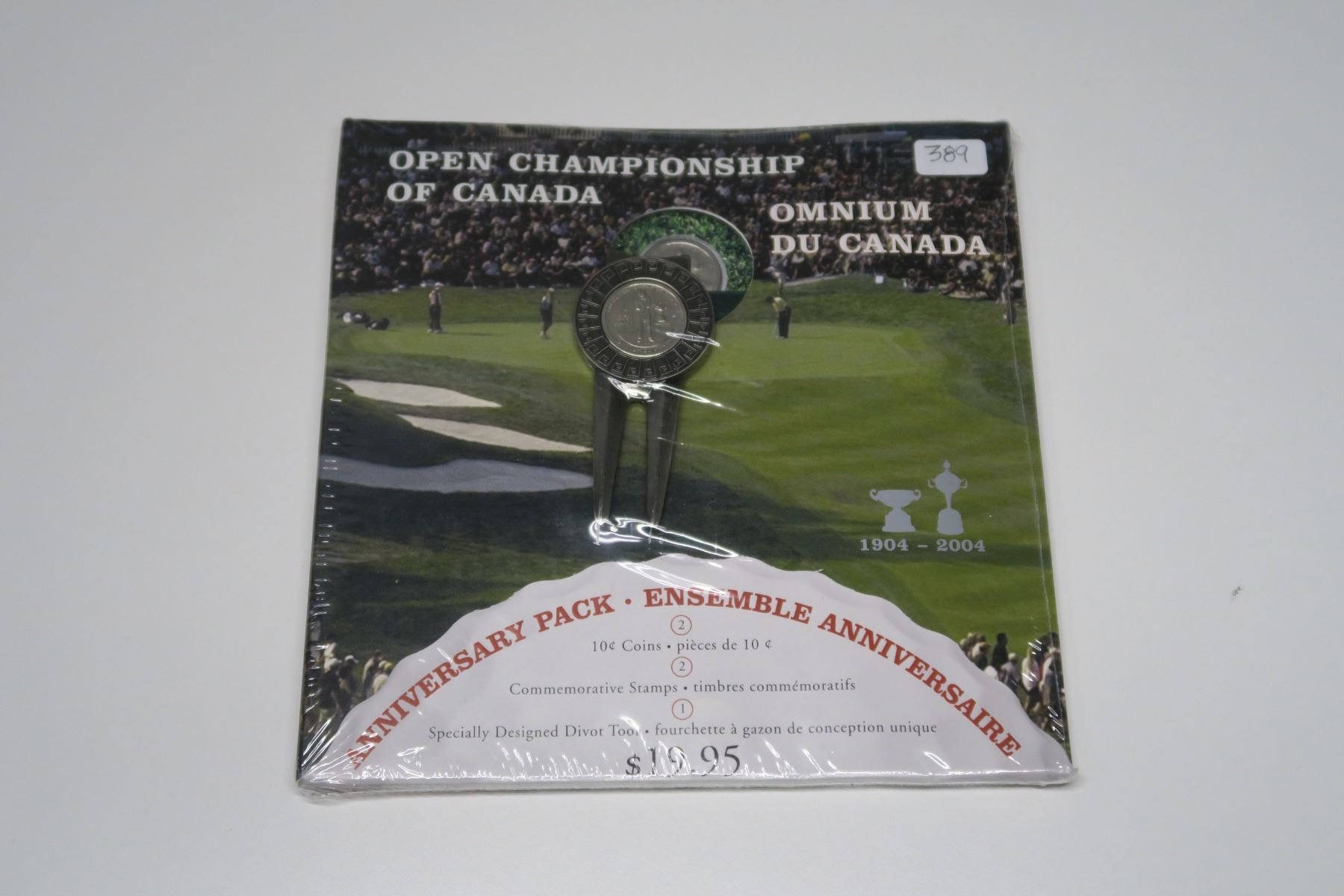 2004 Open Golf Championship of Canada 10 Cents. Includes specially minted 10 cents coin, 2 Golf commemorative Stamps, and a divot repair tool. In original unopened folder.
