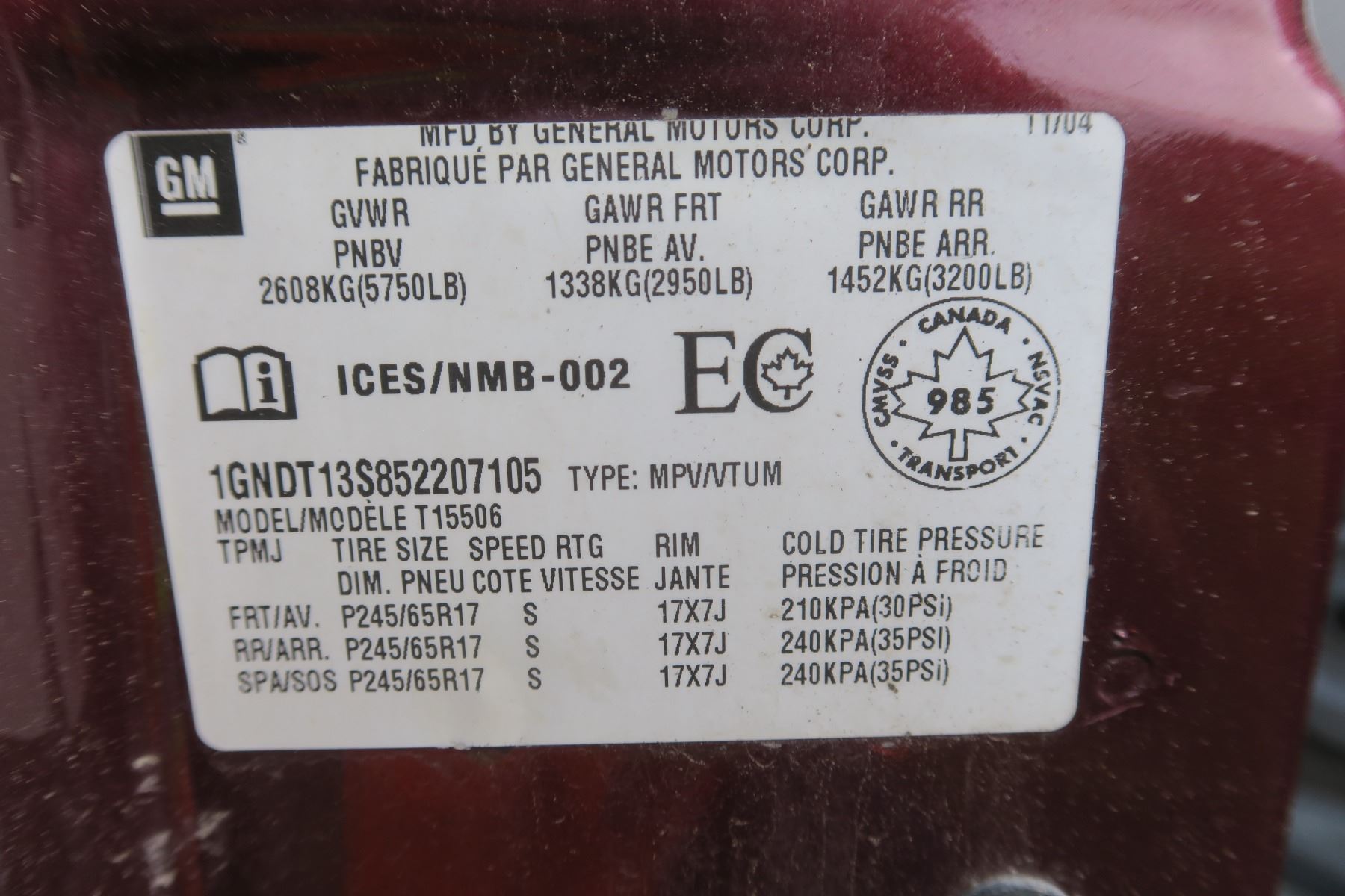 2005 CHEV TRAILBLAZER LT 4WD 1GNDT13S852207105 (No Keys) Sold As Is - SGI Online VIN Lookup: https://www.sgi.sk.ca/vin