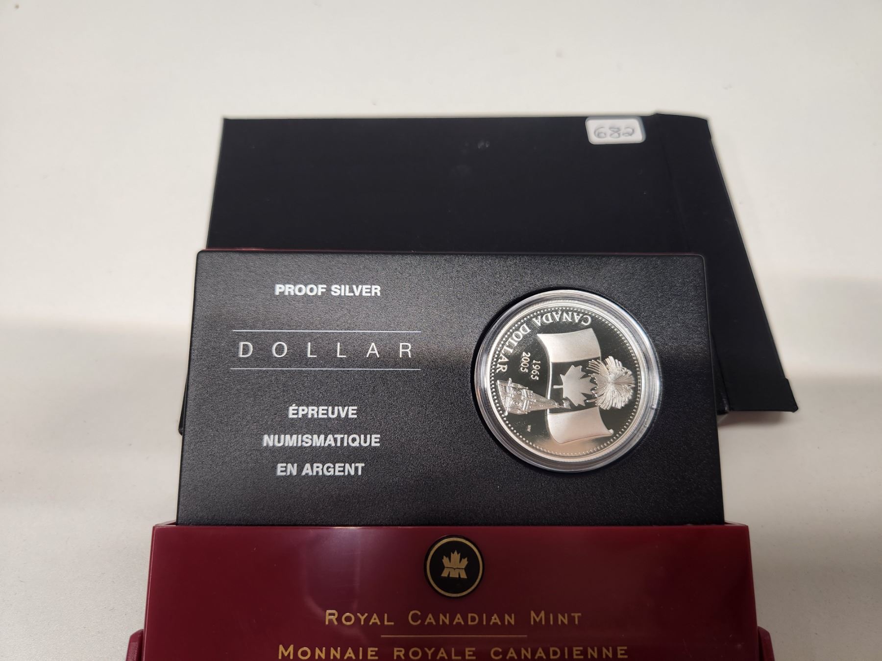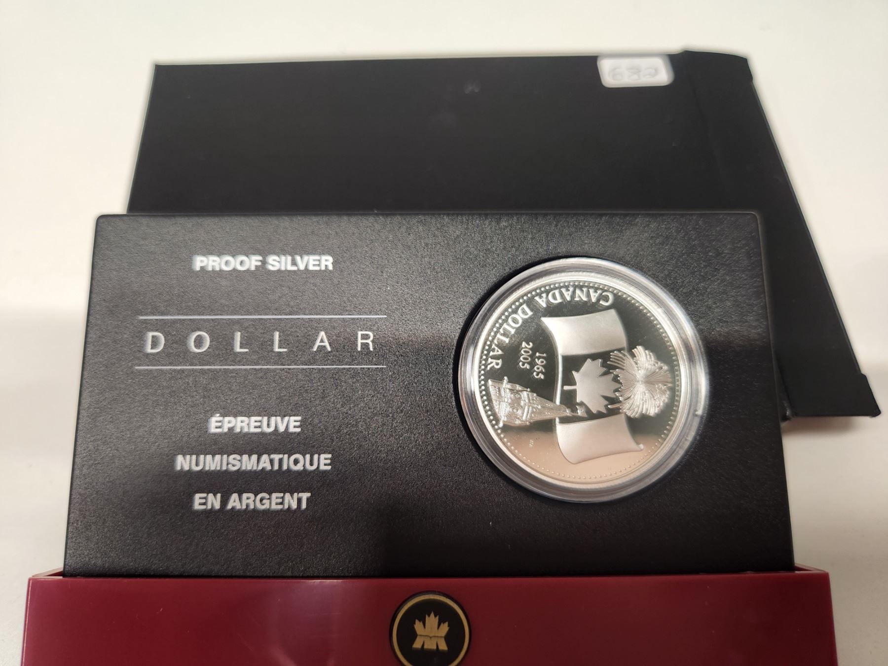 2005 Canada’s Flag Proof Silver Dollar. Commemorates the 40th Anniversary of Canada’s new Flag. 99.99 pure Silver. Bright White with Ultra Heavy Cameo. In case and box of issue.