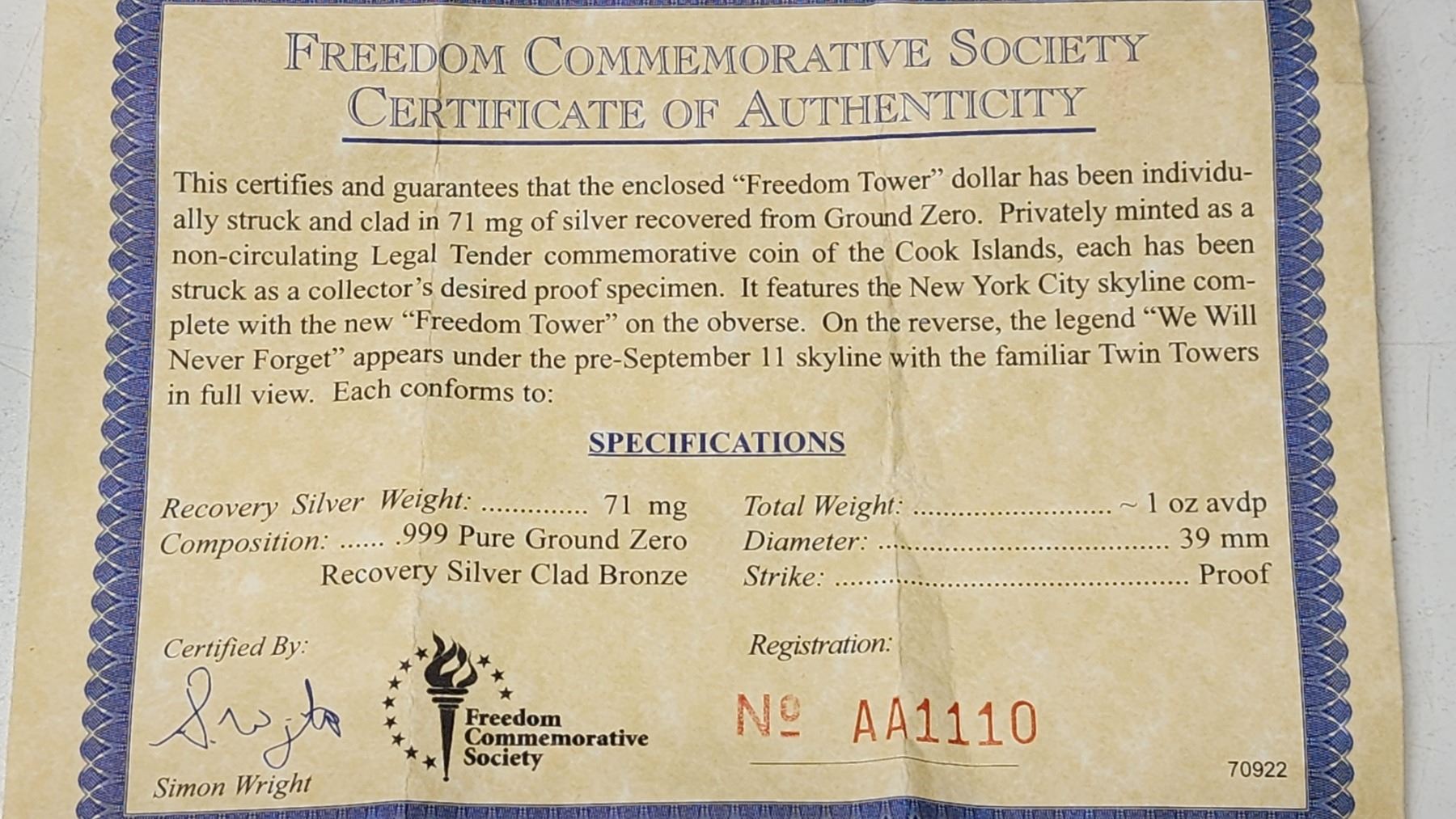 2005 "Freedom Tower" US 1 dollar, .999 silver coin