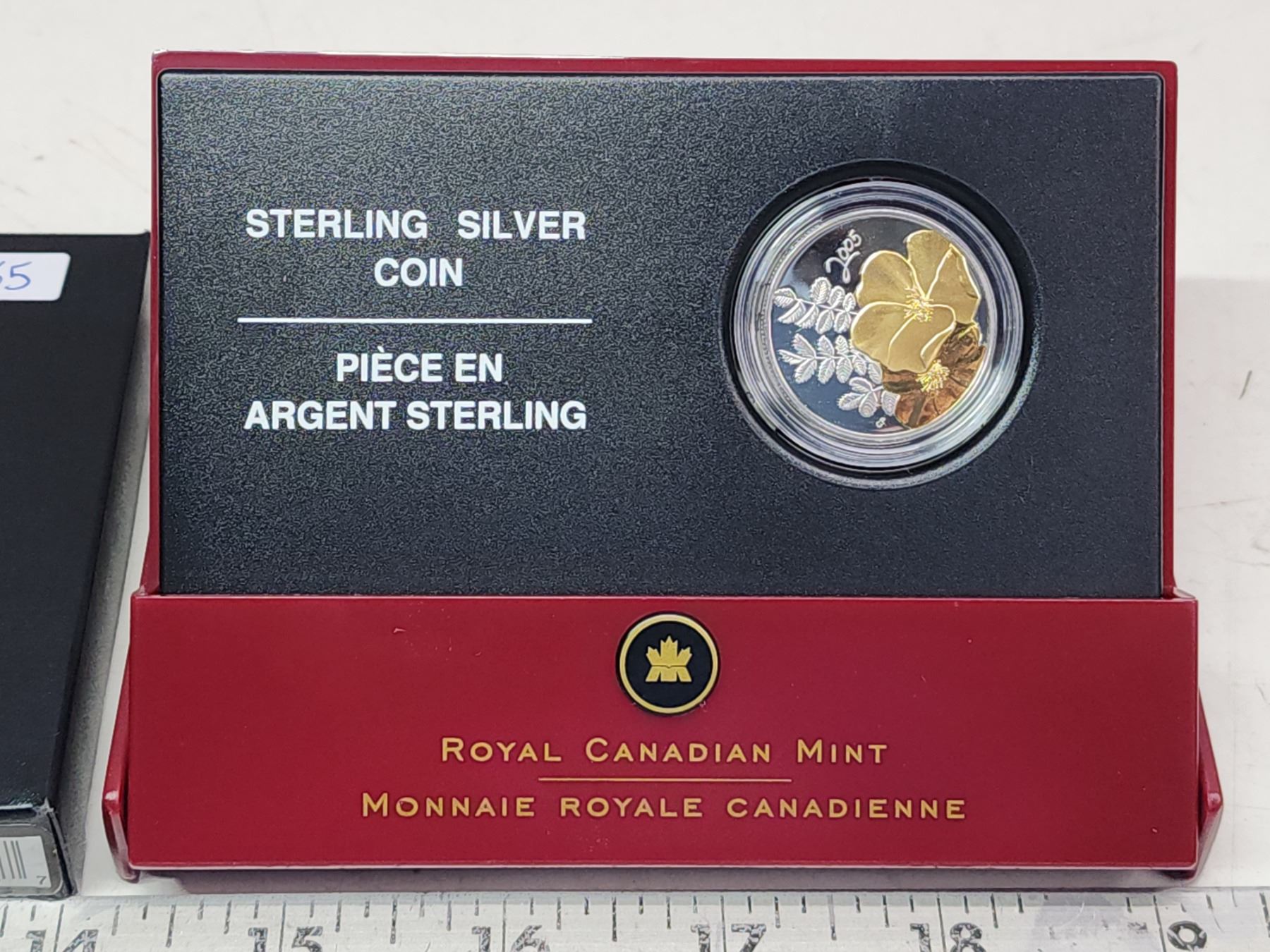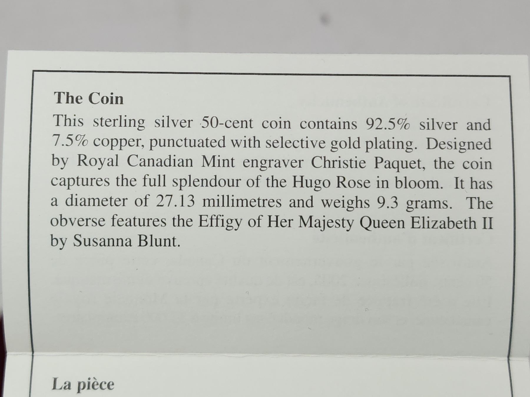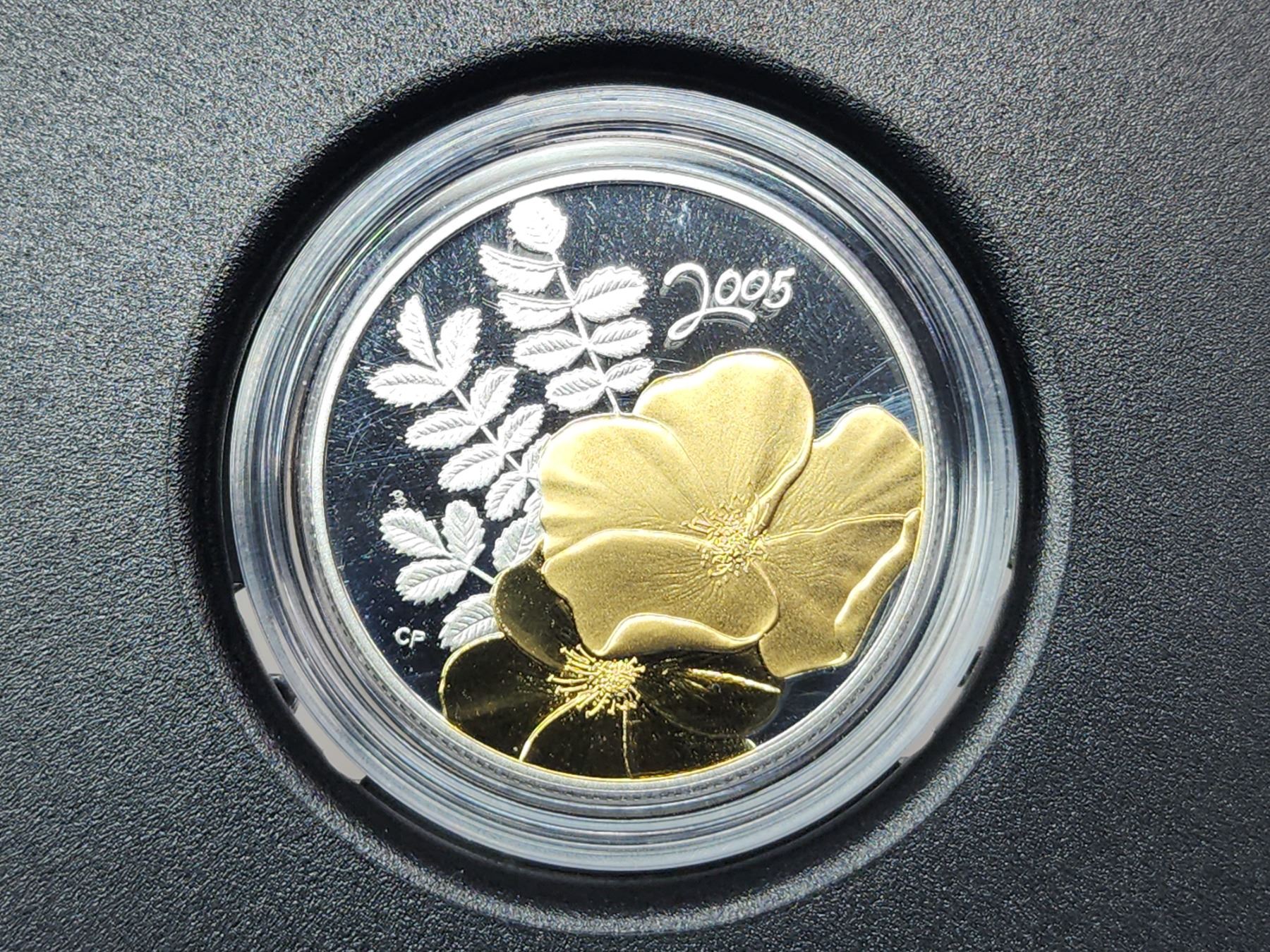 2005 Golden Rose 50 Cents. Sterling Silver with 24-karat gold plating. Proof with Ultra Heavy Cameo. Certificate of Authenticity. Housed in its original Royal Canadian Mint case of issue.
