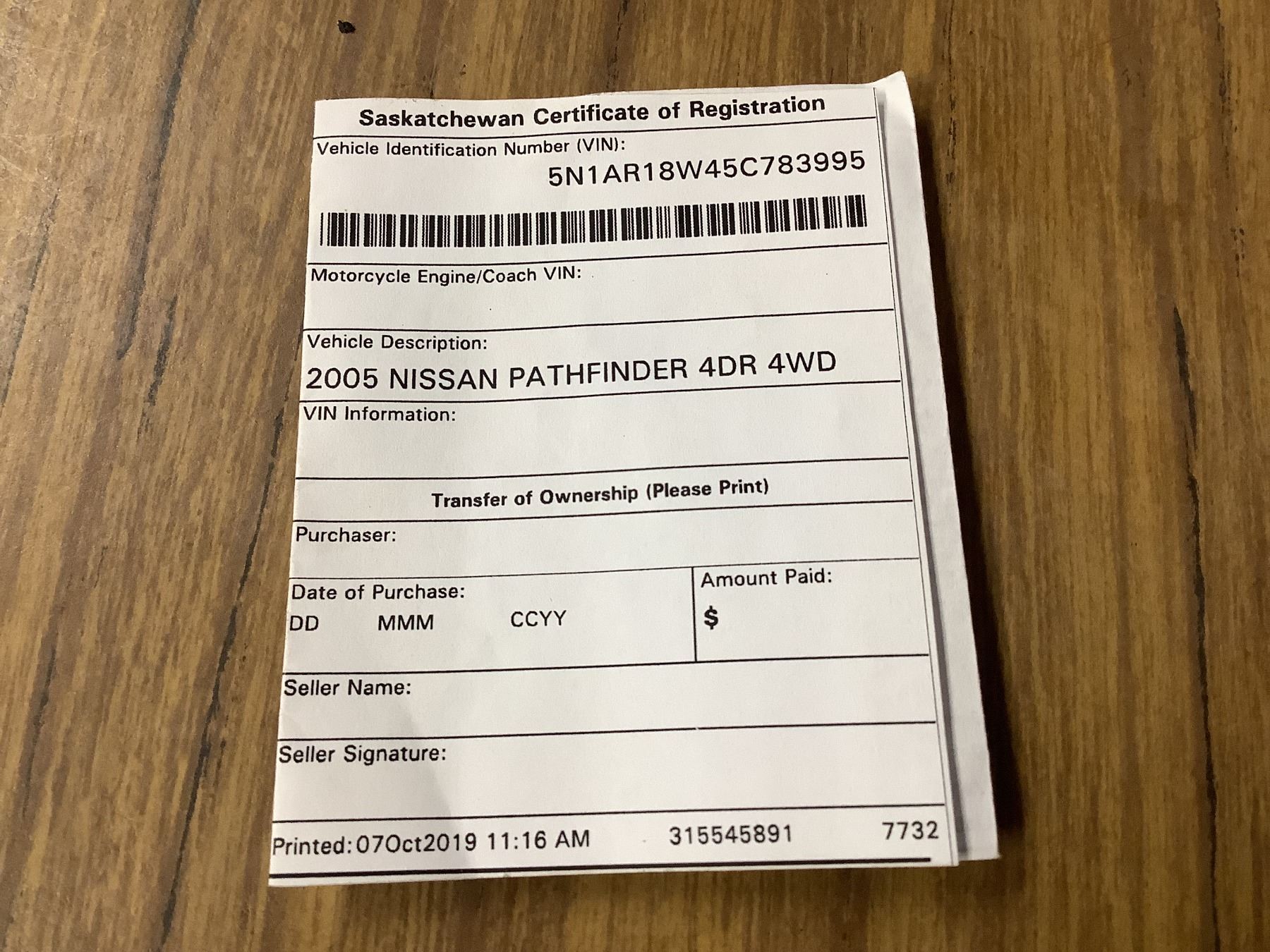 2005 Nissan Pathfinder 4Dr 4WD 5N1AR18W45C783995 4. Litre v6 automatic loaded. Odometer in miles. True mileage unknown.