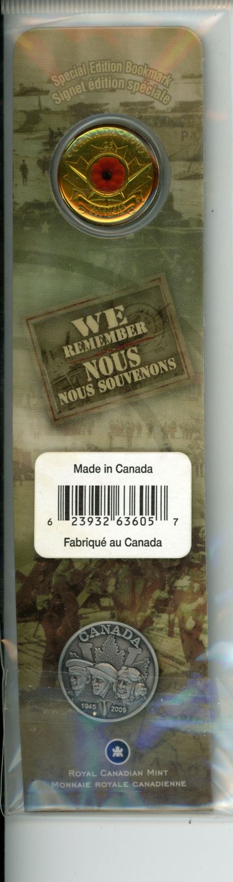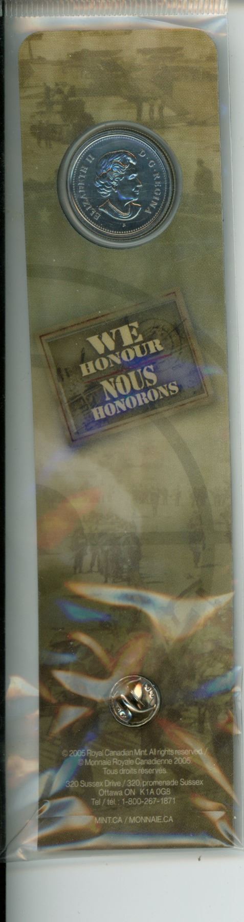 2005P Canadian Colourized Poppy 25 Cents. We Remember. Includes 1945 – 2005 60th Anniversary of the end of World War II pin. Housed in its original unopened Royal Canadian Mint packaging.