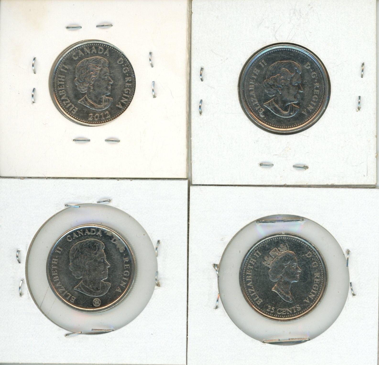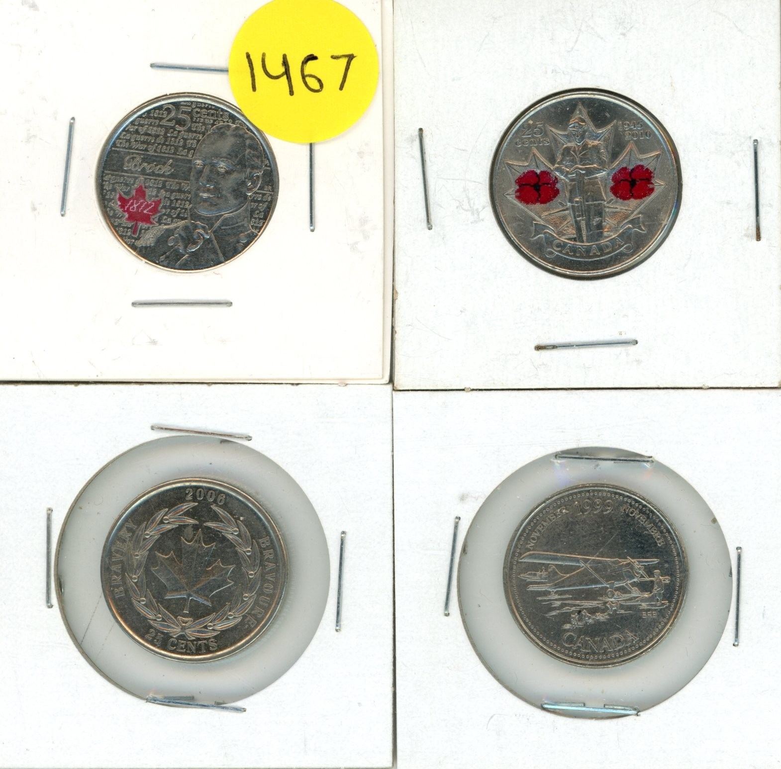 2006 Canada Red Poppies 25 Cents, 2012 Canada Sir Isaac Brock and a red maple leaf to mark the bicentennial of the War of 1812, 2006 Canadian 25-cent coin celebrating the Medal of Bravery and 1999 Canadian 25-cent coin from the Millennium Series