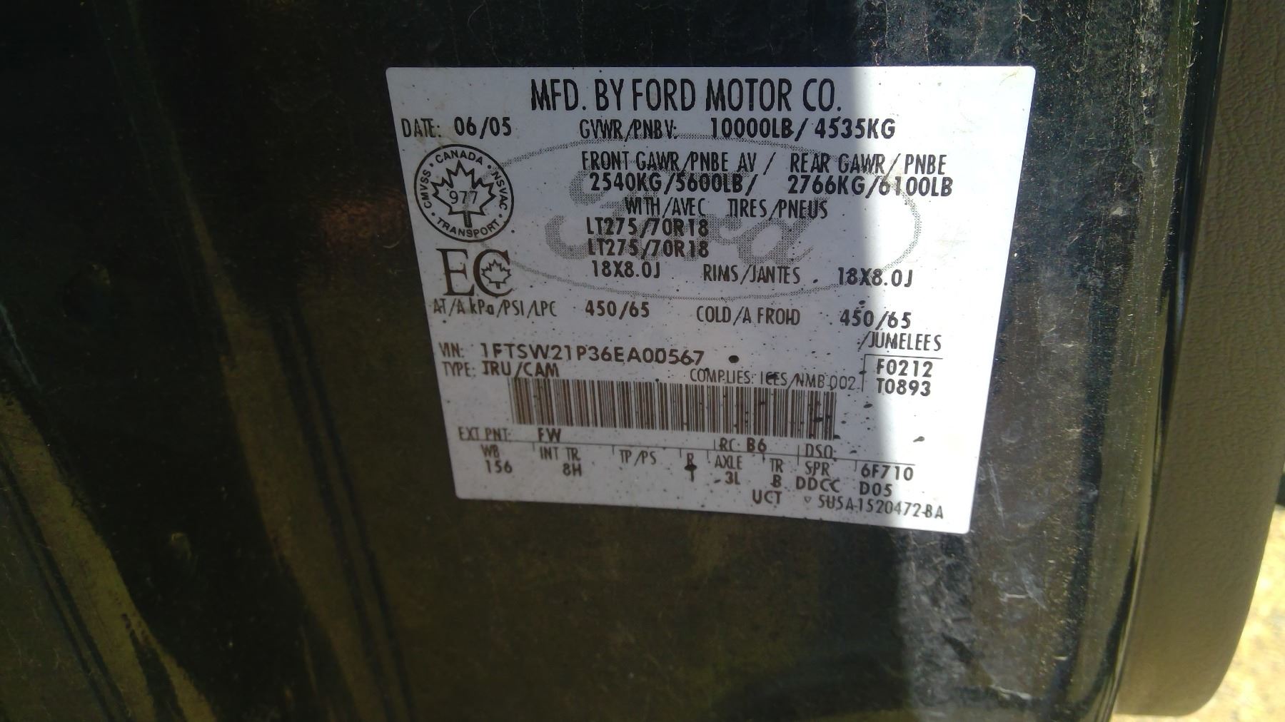 VIN: 1FTSW21P36EA00567 Note: If you have questions regarding the status of this VIN, please contact SGI's Customer Service Centre 1-800-667-9868