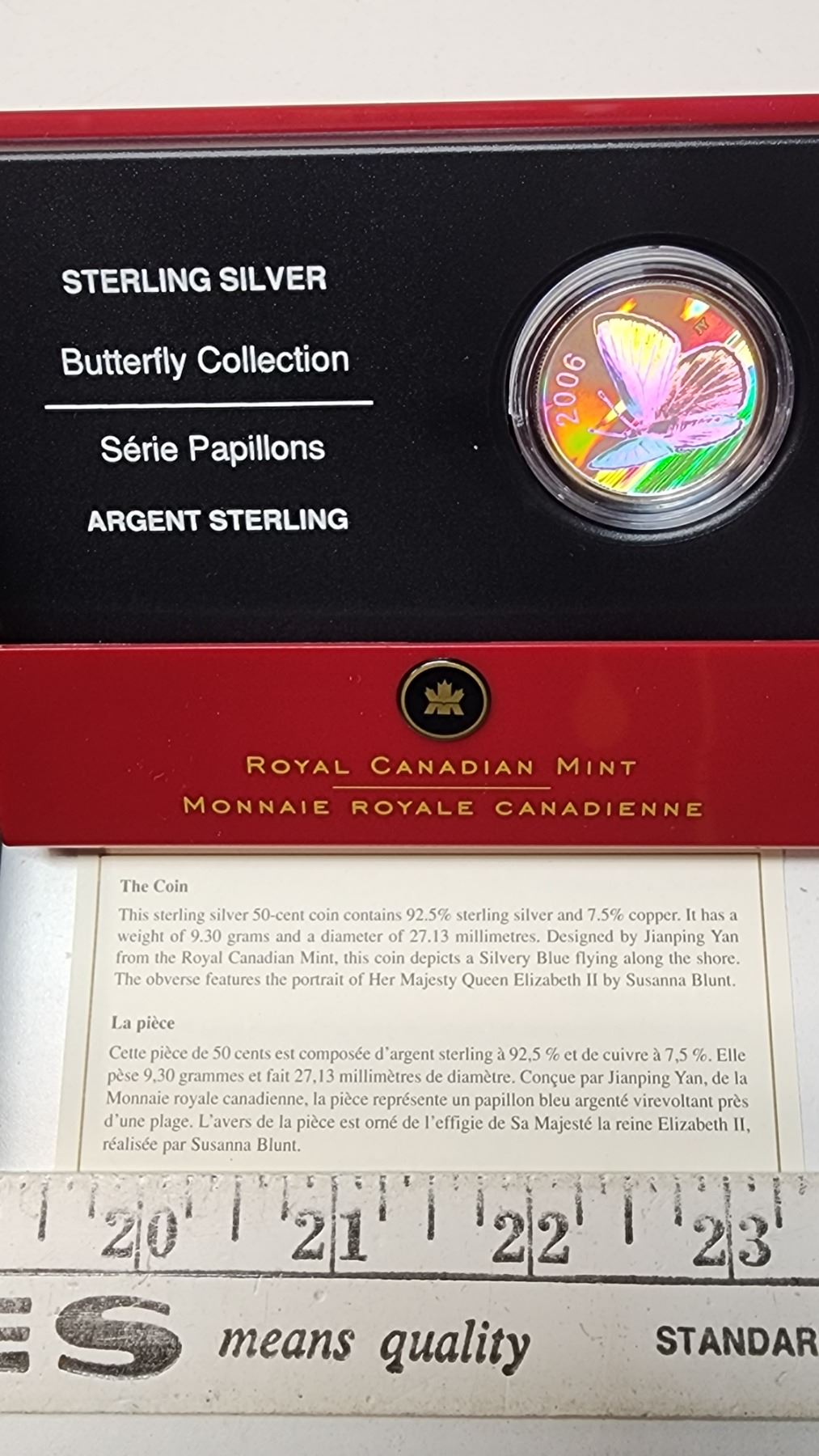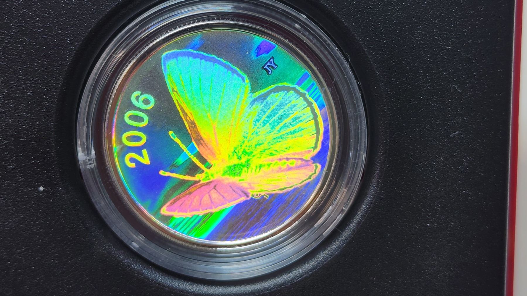 2006 Silvery Blue Butterfly 50 Cents. With Hologram. Sterling Silver. Proof with Ultra Heavy Cameo. Housed in its original case & box of issue.