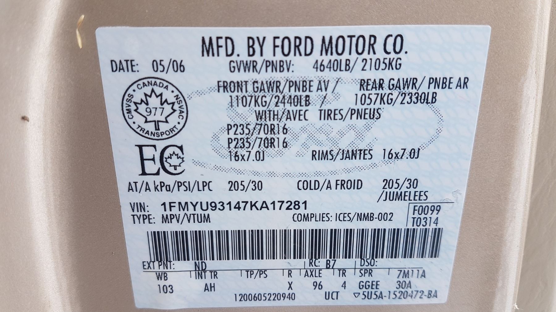 2007, FORD ESCAPE XLT V6 4WD 1FMYU93147KA17281 (NO KEYS)