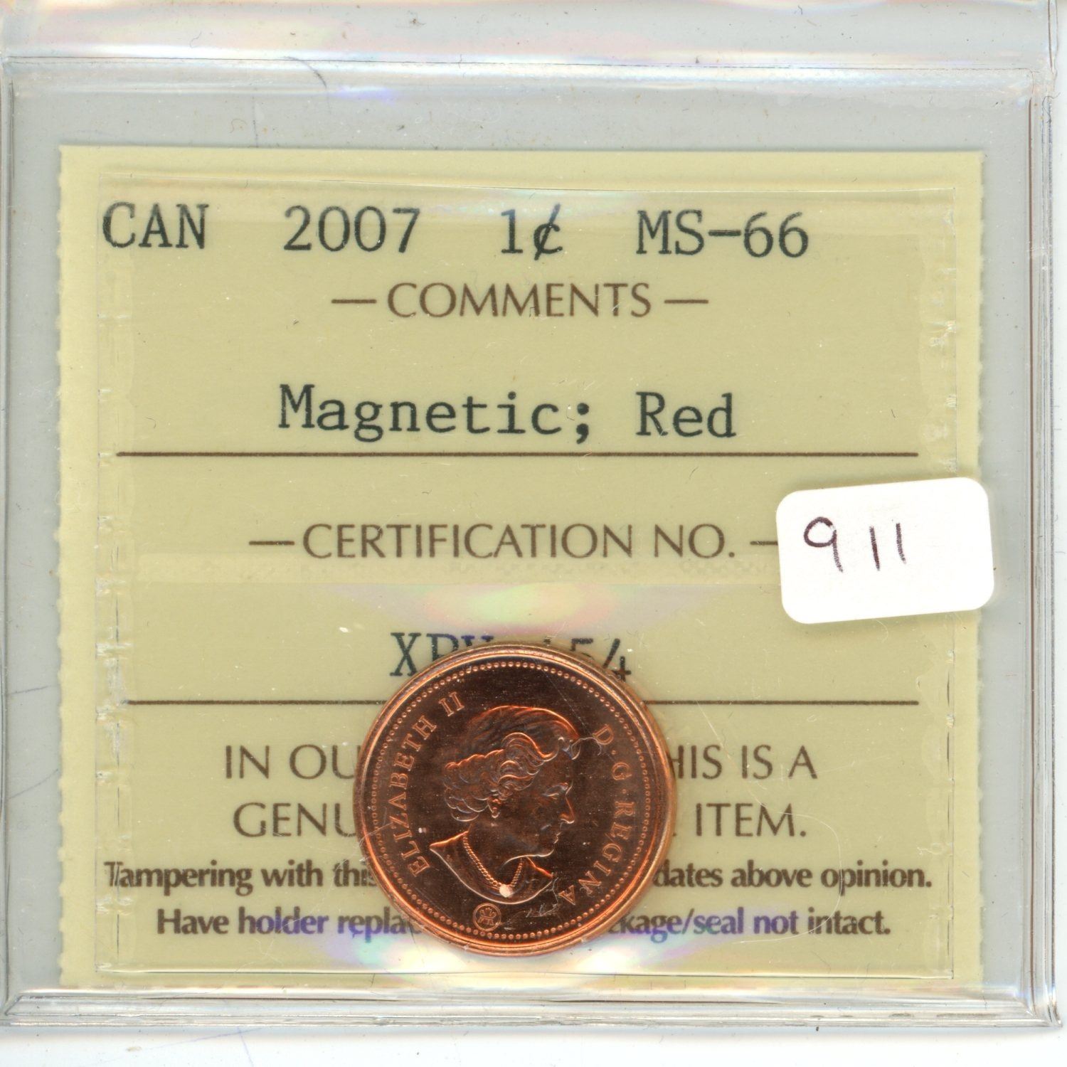 2007 Graded Canadian Penny - MS-66: Magnetic; Red