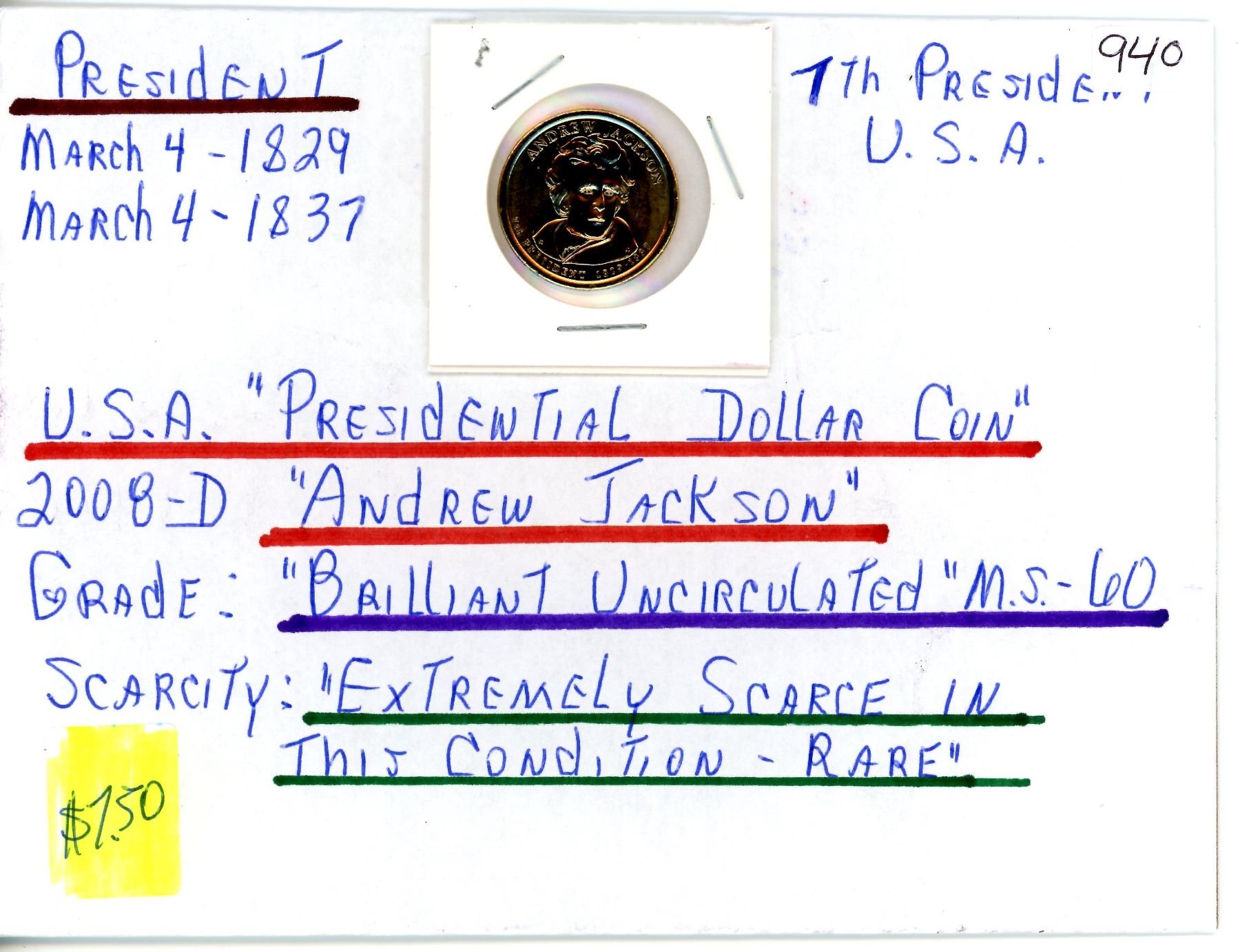 2008-D USA Presidential Dollar Coin, 7th President Andrew Jackson