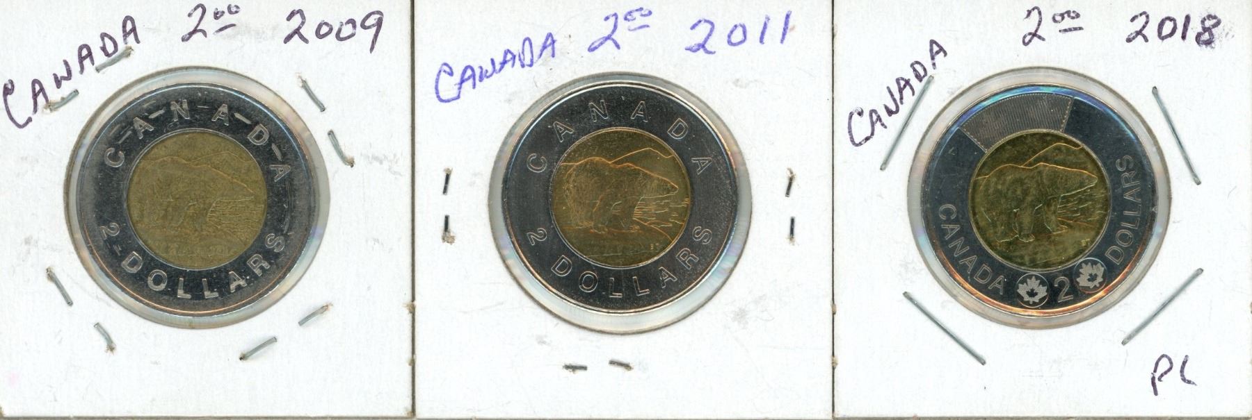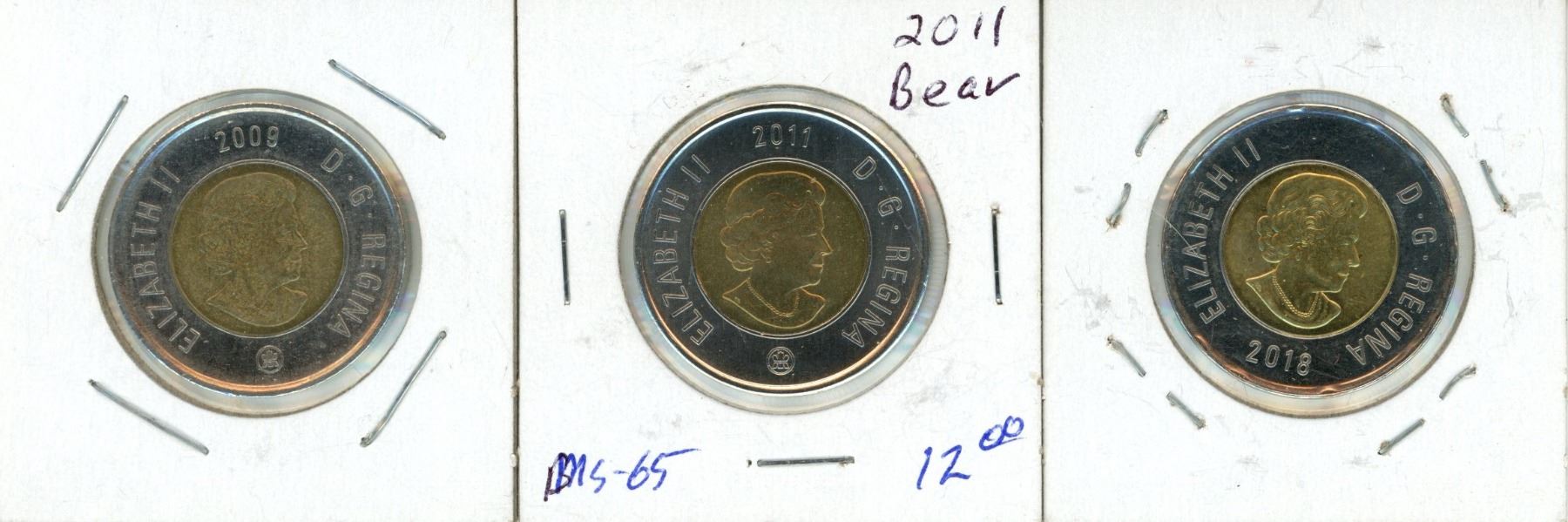 2009 Canadian Toonie, 2011 Canadian Toonie - The Bear and 2018 Canadian Toonie - PL.
