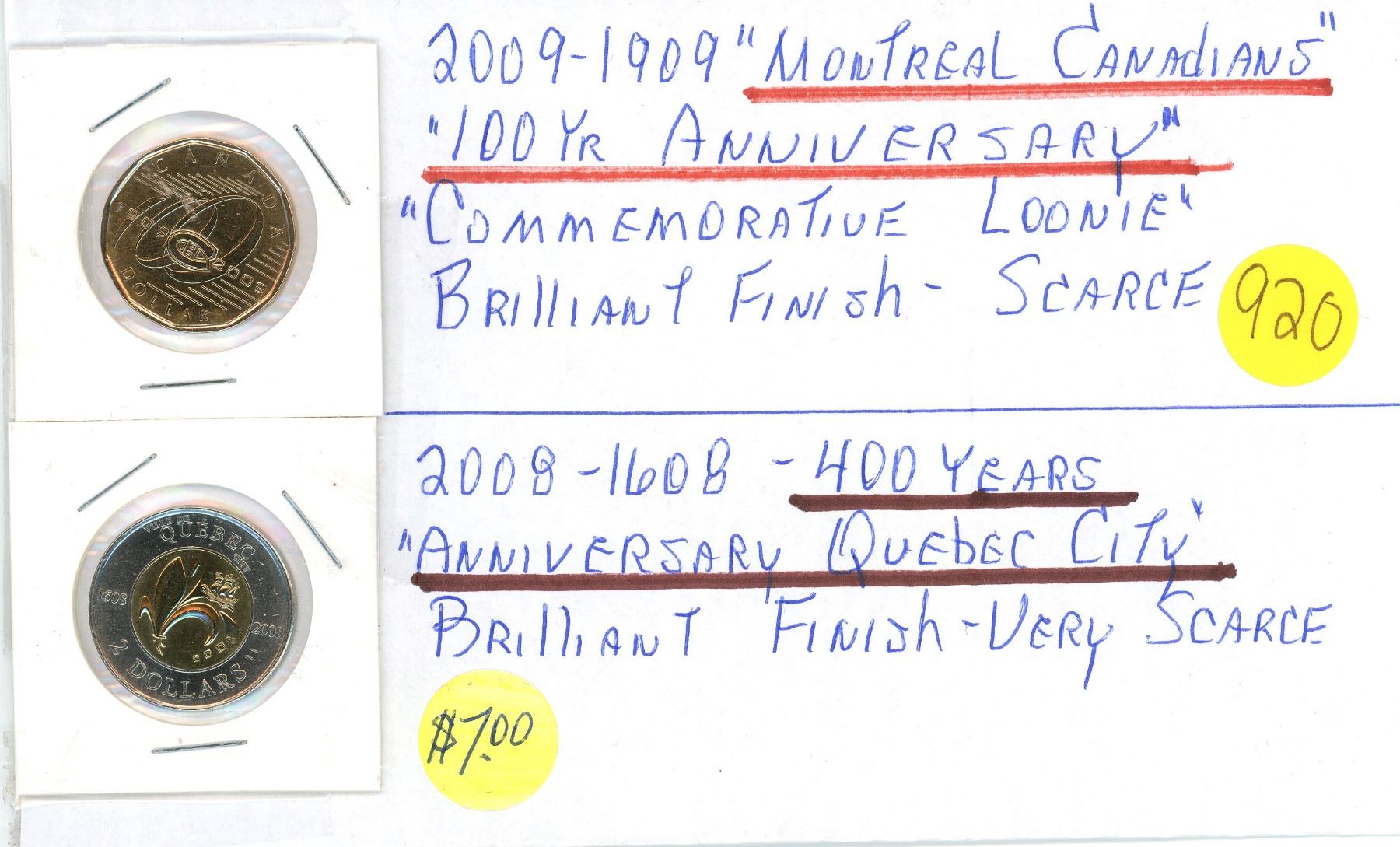 2009 "Montreal Canadiens" Loonie and 2008 "Anniversary Quebec City" Toonie