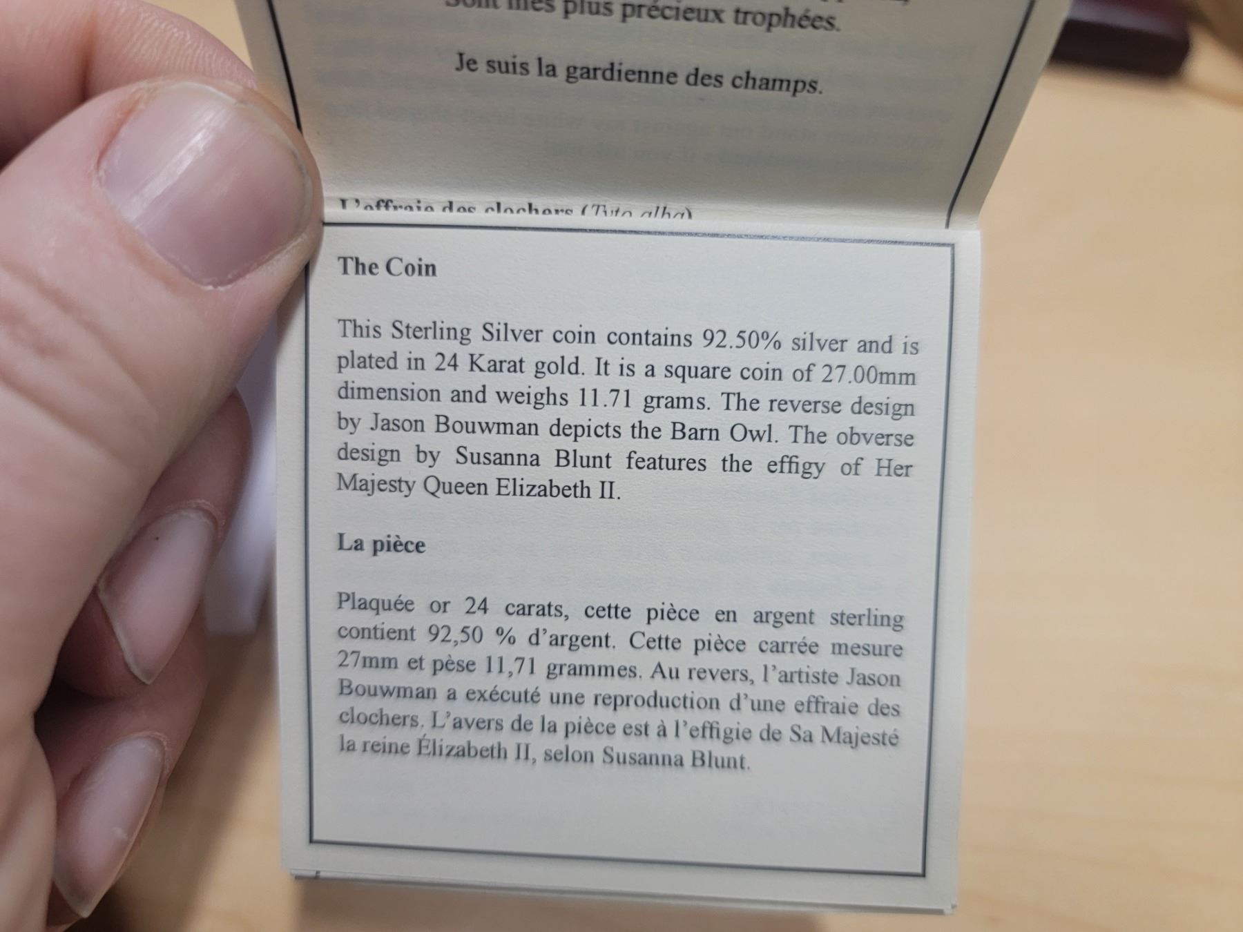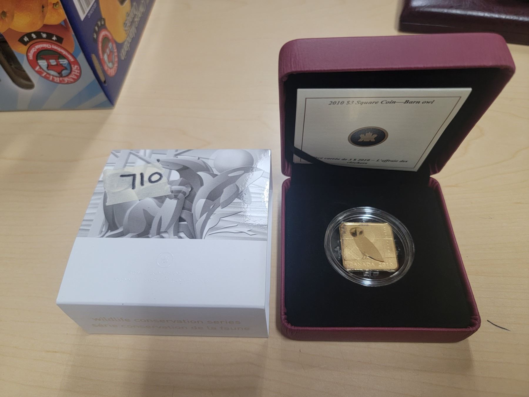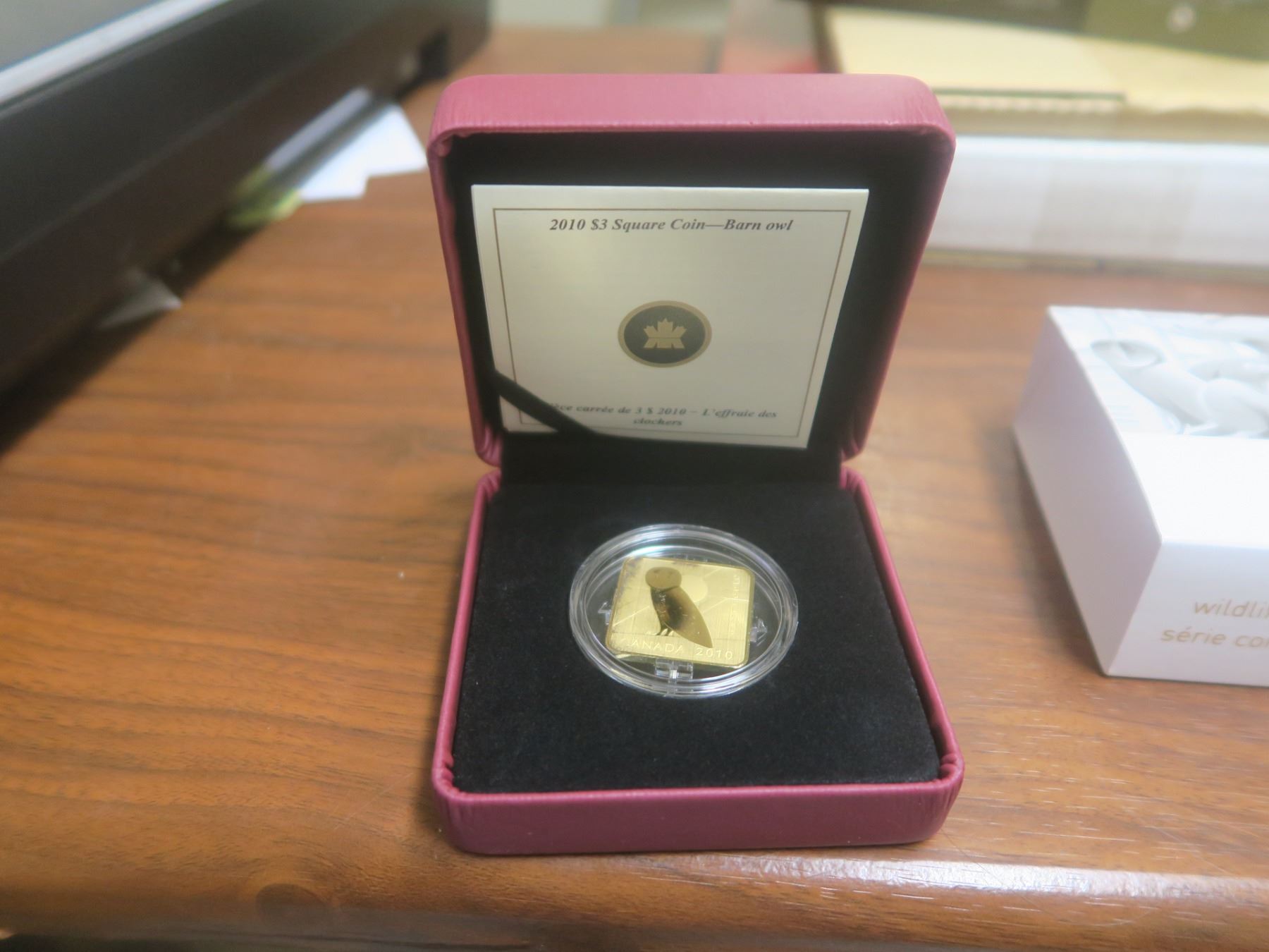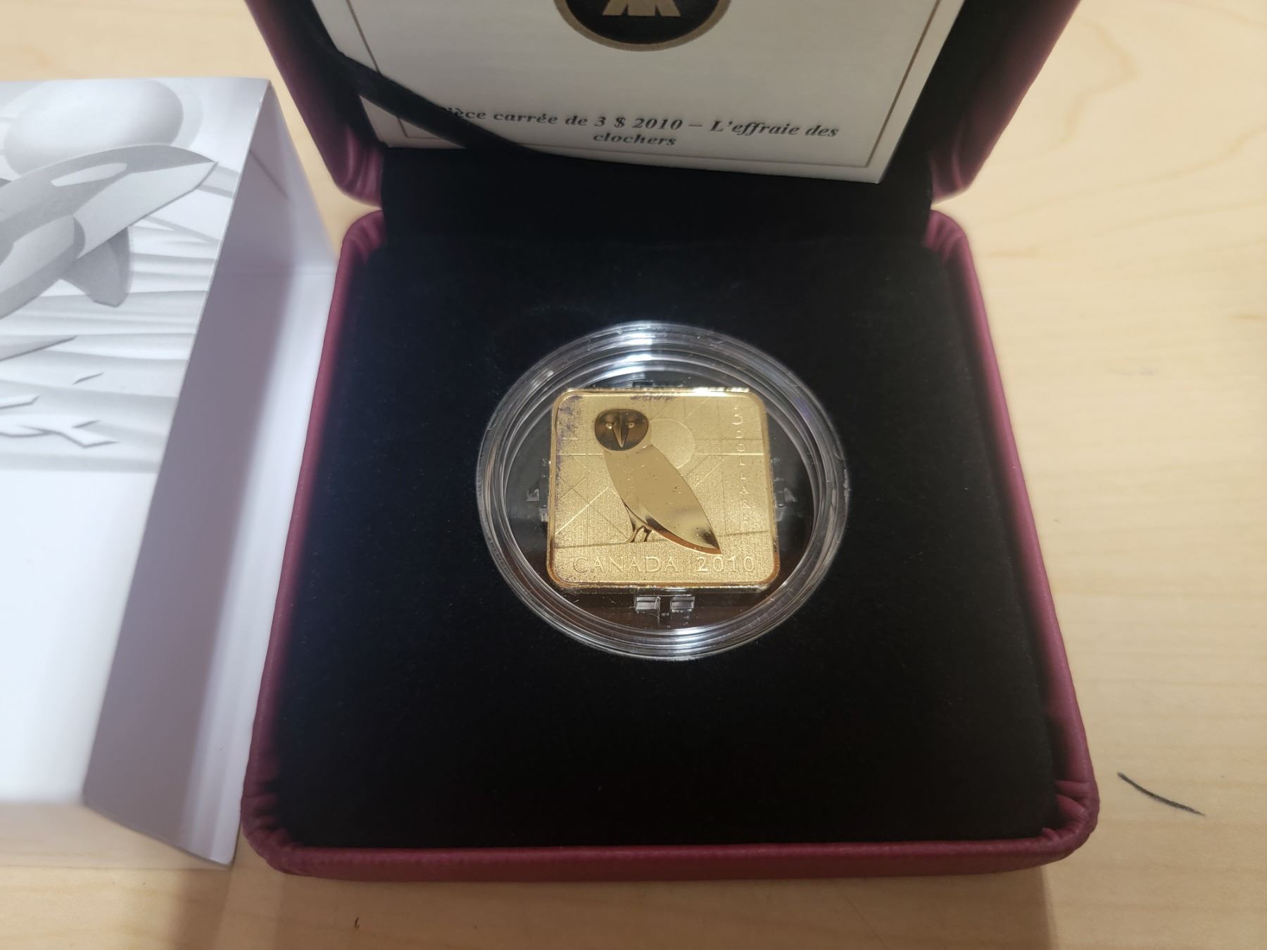 2010 $3 92.5 silver 24k gold plated square coin - barn owl
