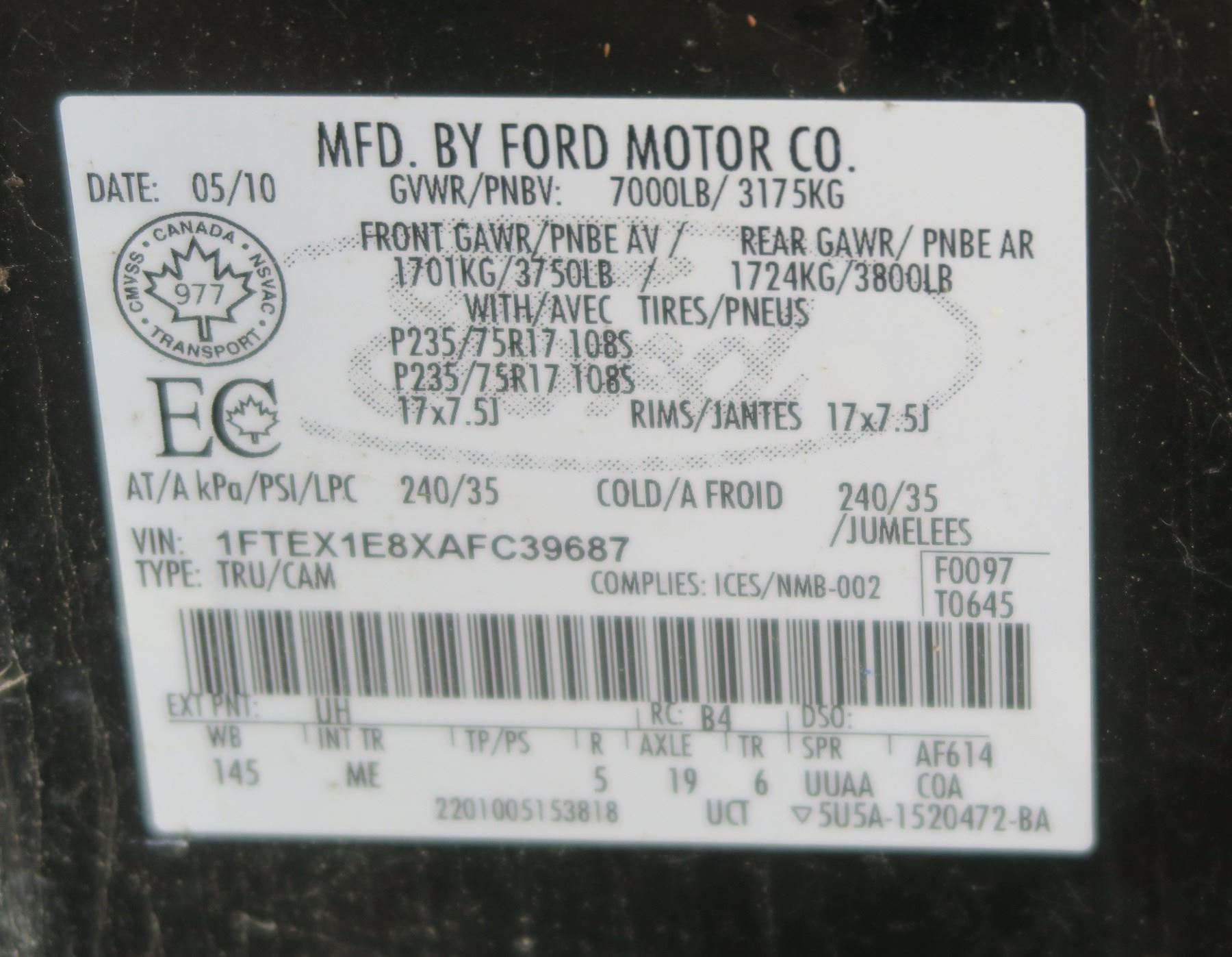 2010 FORD F150 SUPERCAB 4WD 1FTEX1E8XAFC39687 (No Keys) Sold As Is - SGI Online VIN Lookup: https://www.sgi.sk.ca/vin