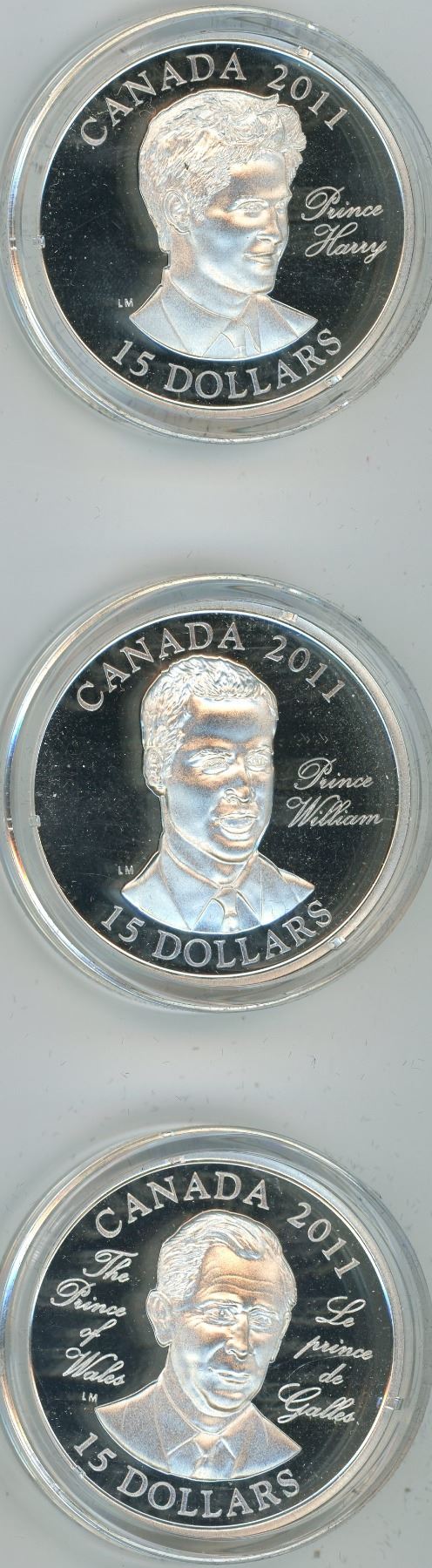 2011 CANADA $15.00 SILVER CONTINUITY OF THE CROWNSET 3 COINS PRINCE CHARLES, PRINCE WILLIAM, AND PRINCE HARRY