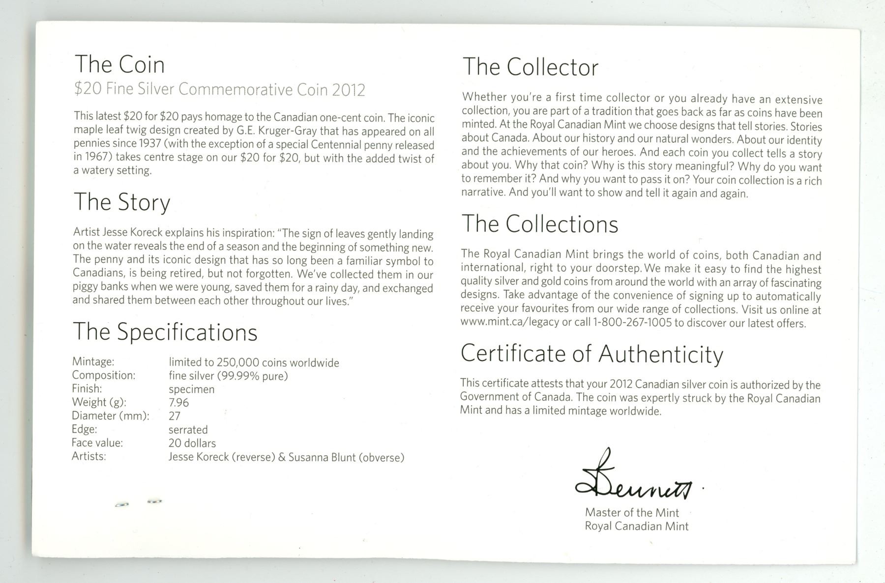 2012 "Farewell to the Penny" Canadian fine silver 20 dollar coin