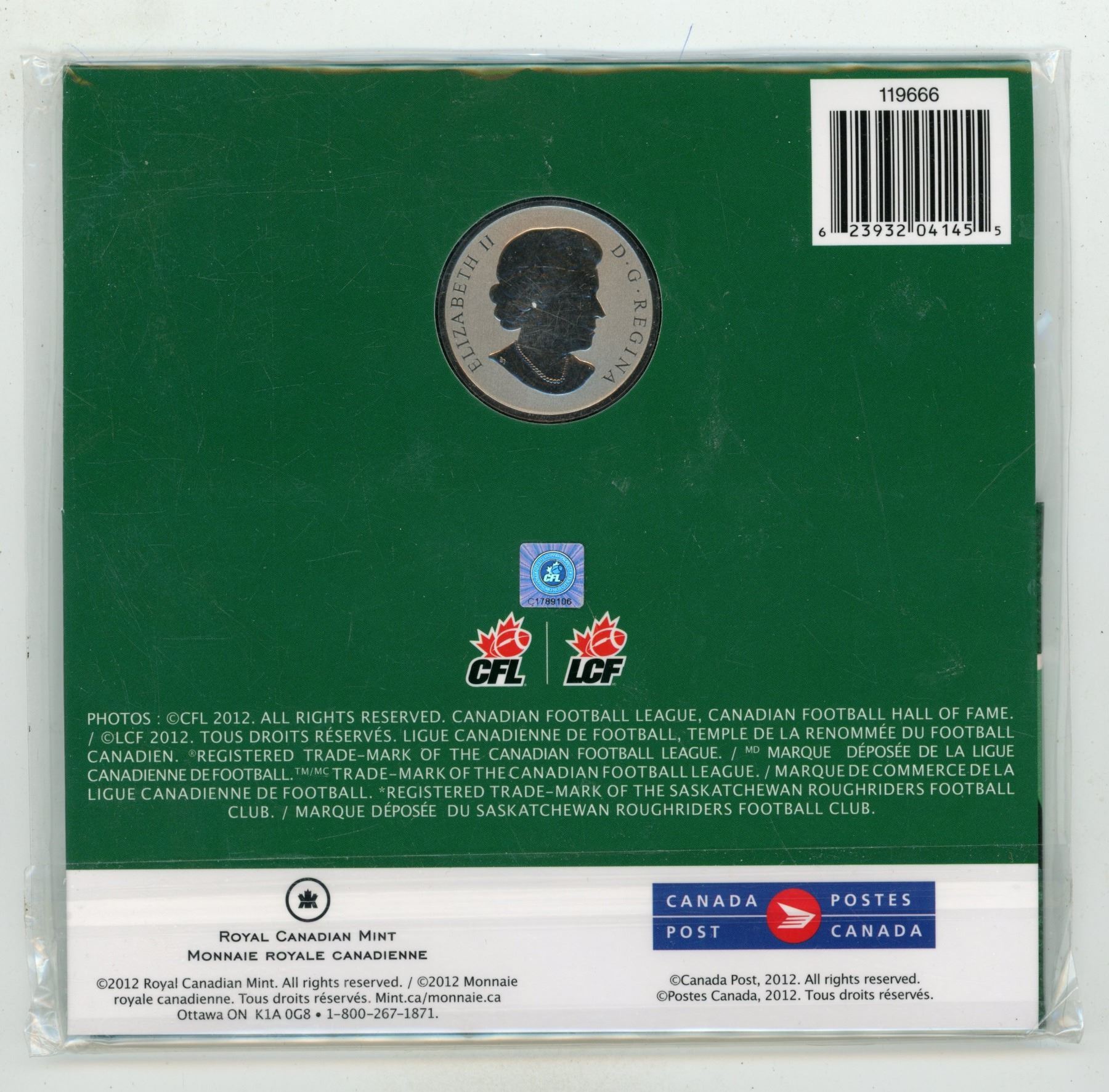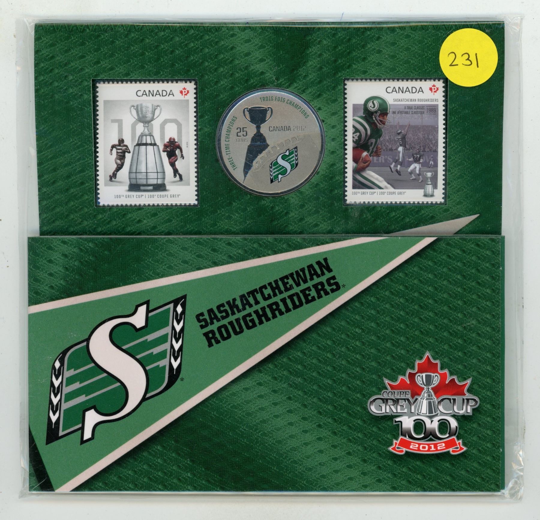 2012 Saskatchewan Roughriders 25 Cents plus 2 Stamps. Housed in its original unopened Royal Canadian Mint packaging.