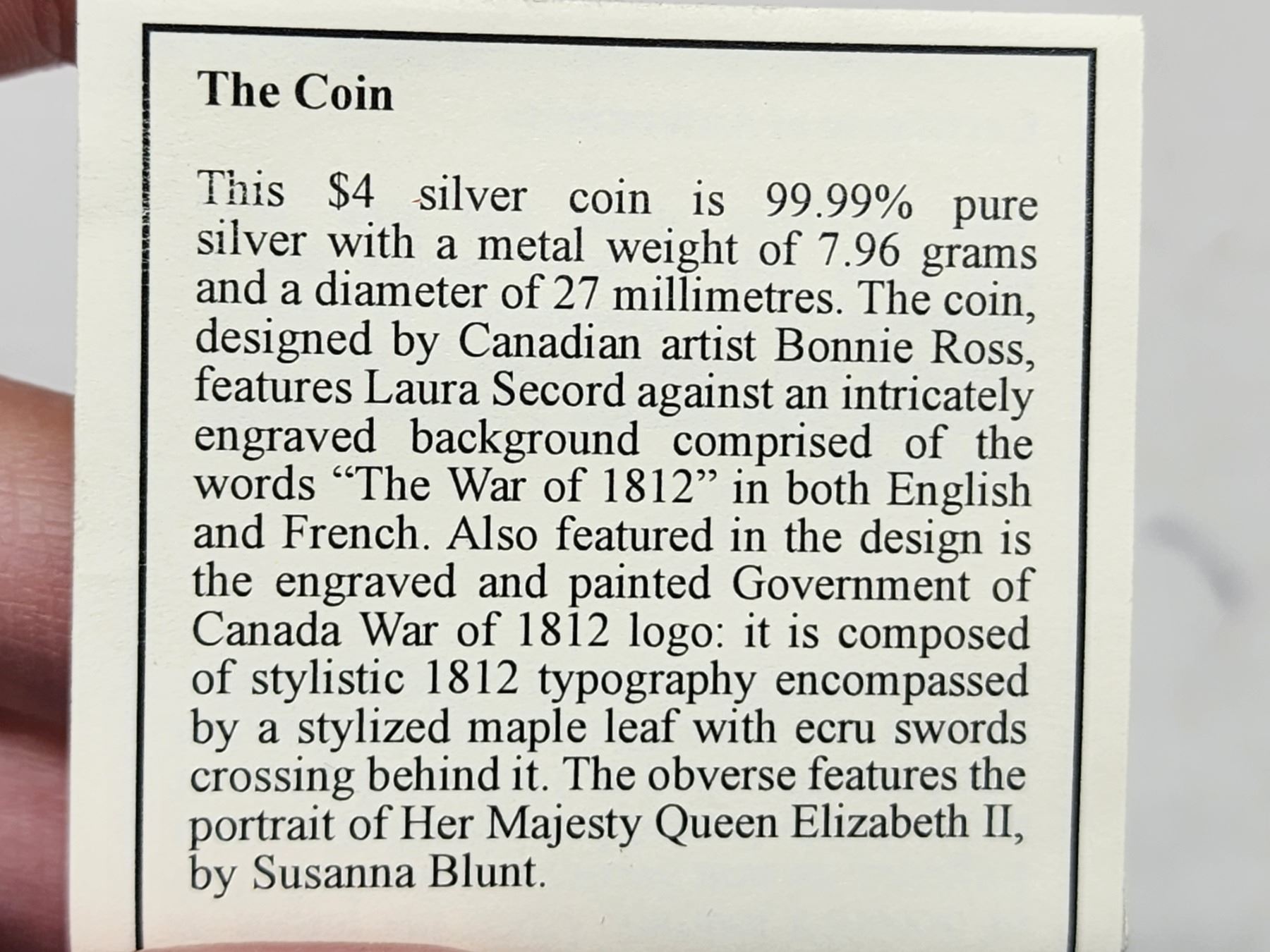 2013 Canadian 4 dollar, .999 silver coin - Heroes of 1812/Laura Secord