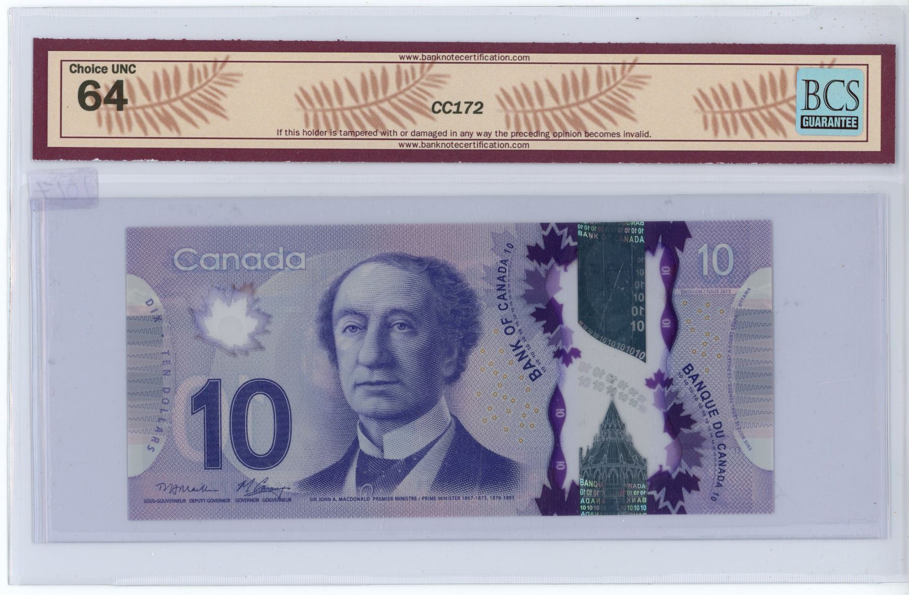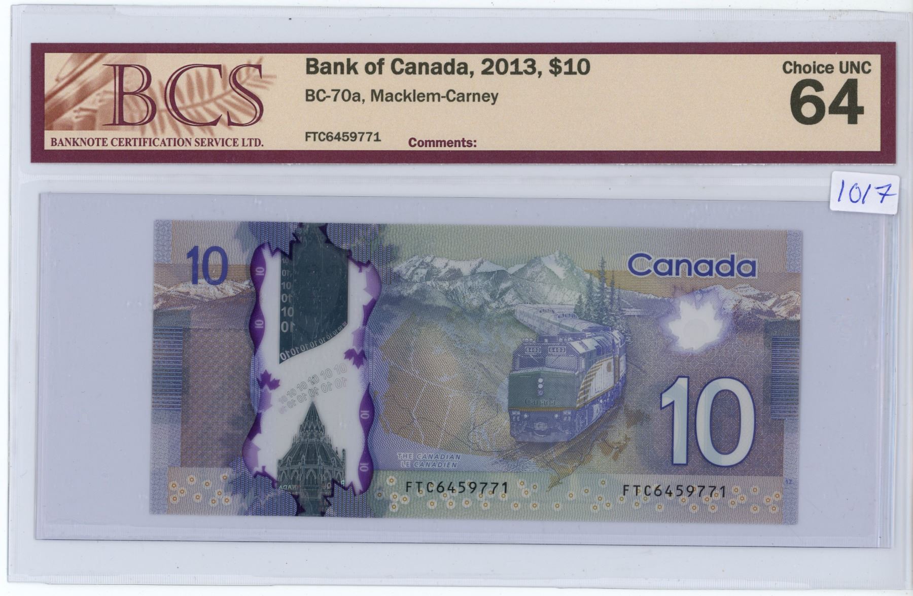 2013 Graded Canadian 10 dollar bill - Macklem/Carney - Prefix FTC 6459771 - BCS-UNC 64