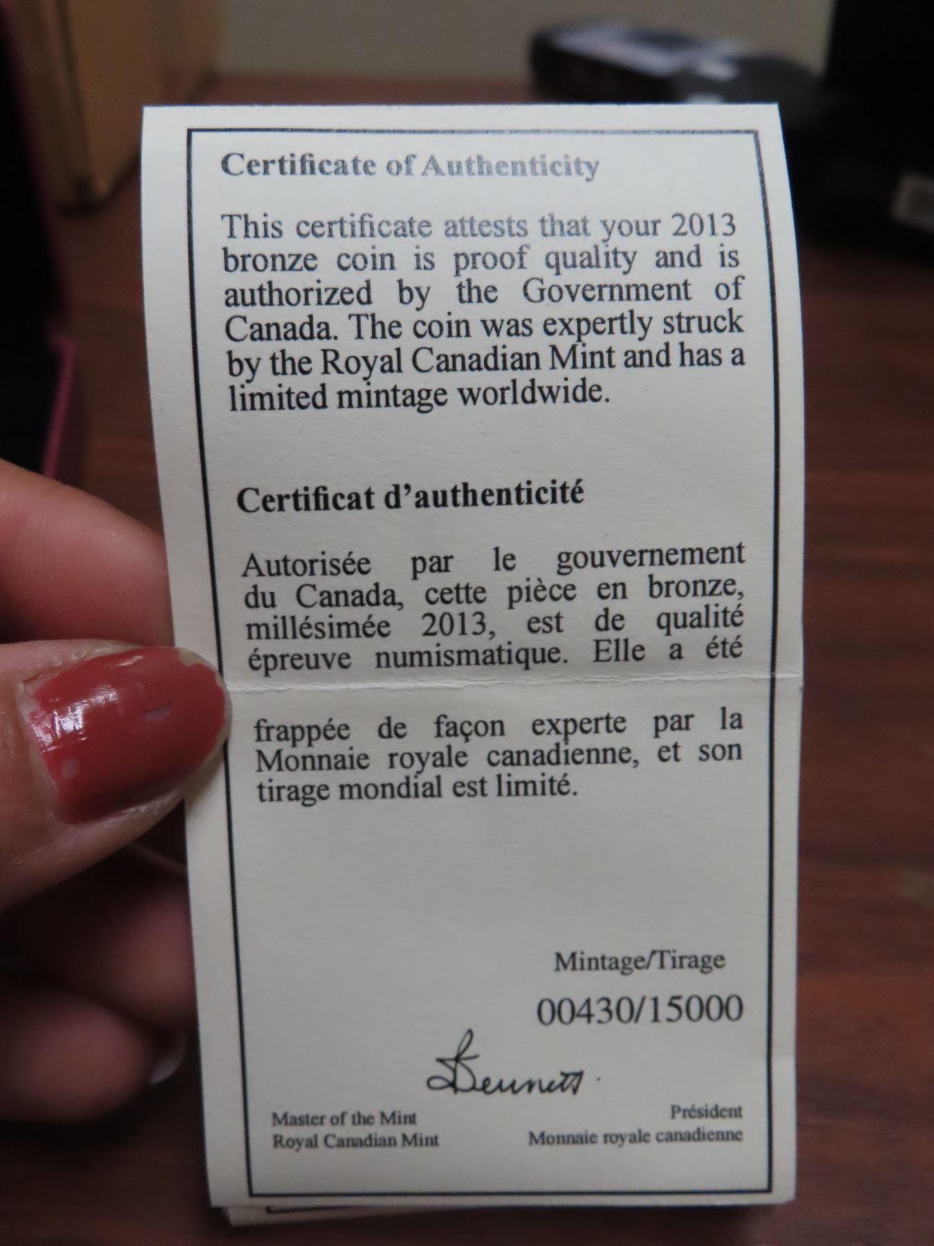 2013 canada proof bronze $3 coin, canada : An allegory, COA