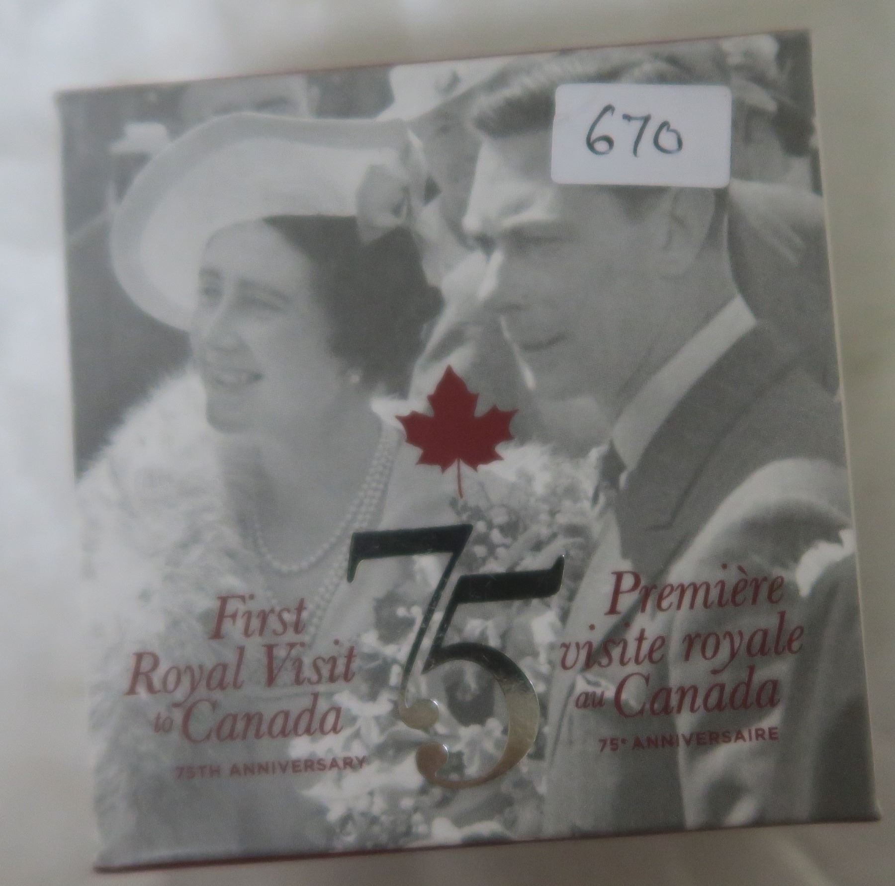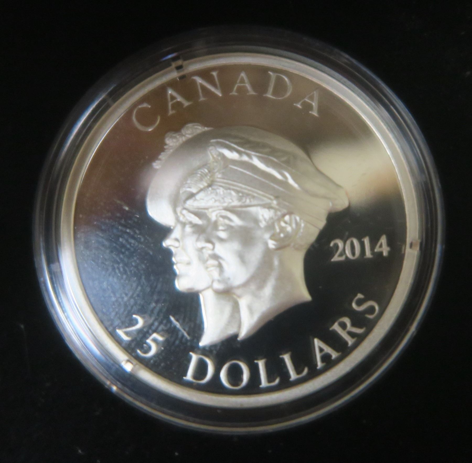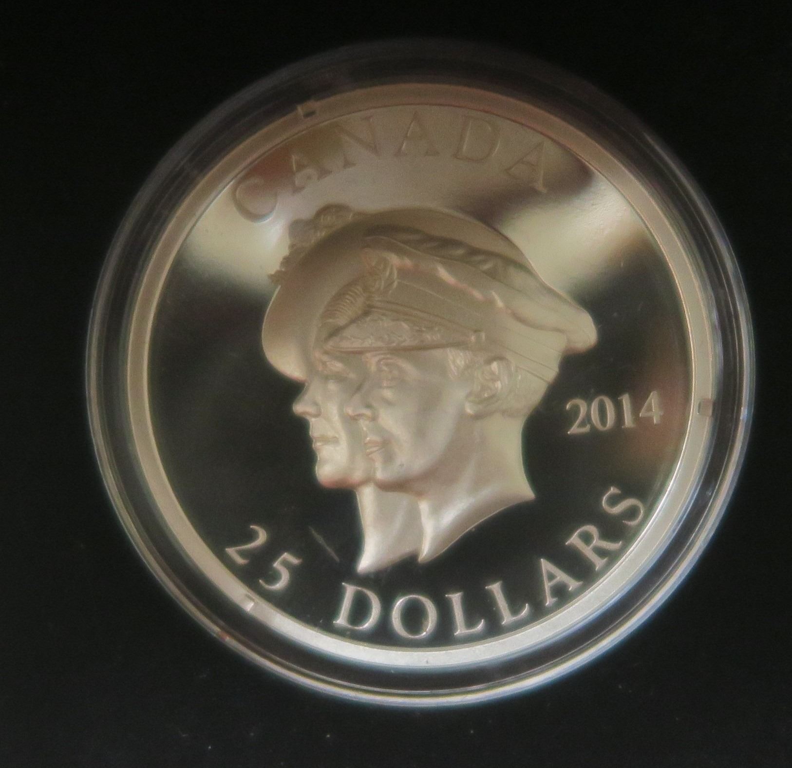 2014 $25 75th Anniversary of the First Royal Visit in 1939. Co-joined busts of King George VI & Queen Elizabeth. 99.99% pure Silver. Proof with Ultra Heavy Cameo. Housed in its original RCM case & box of issue.