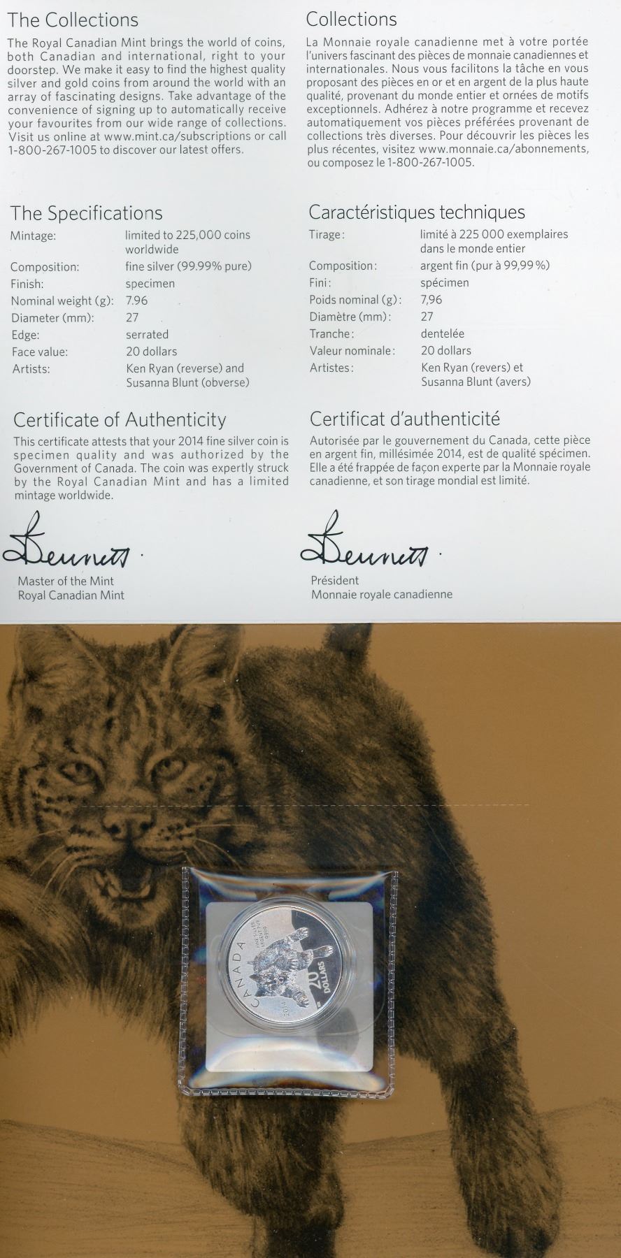 2014 Canada Fine Silver Twenty-Dollar “Lynx” Coin