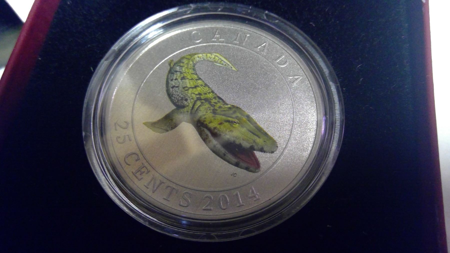2014 Coloured Tiktaalik 25 Cents. Specimen. This pre-historic animal bridged the gap between water and land. Housed in its original case and box of issue. Nice.