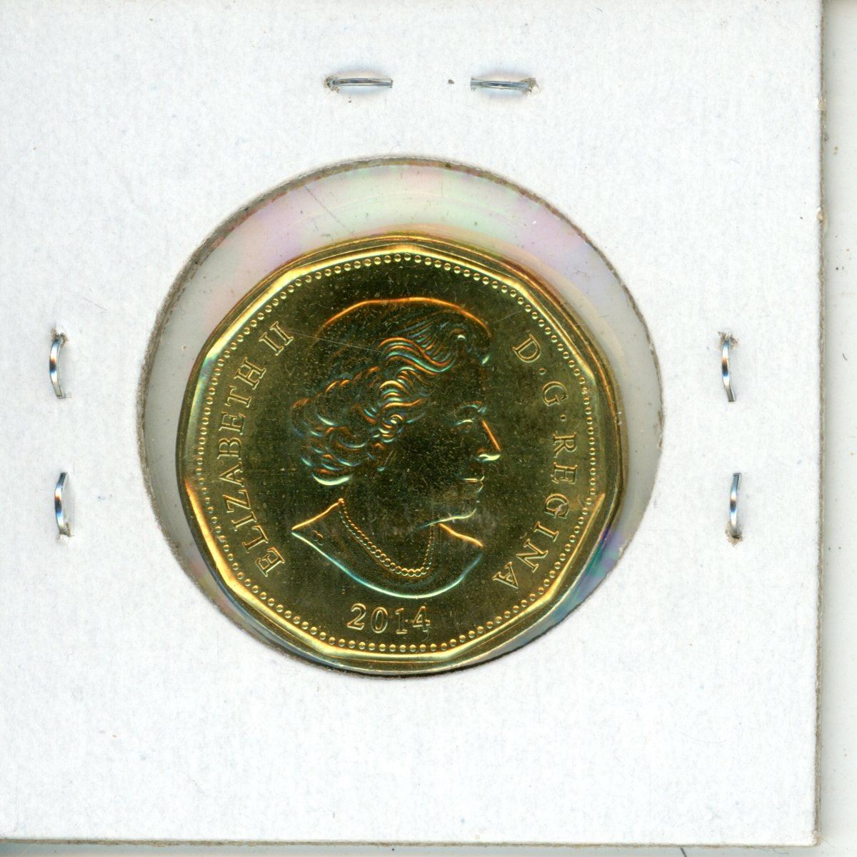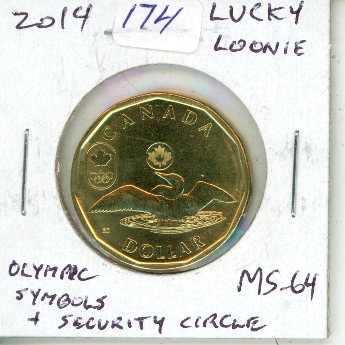 2014 Lucky Loonie Dollar. Olympic symbols & Security Circle. MS-64 from an original Royal Canadian Mint roll.