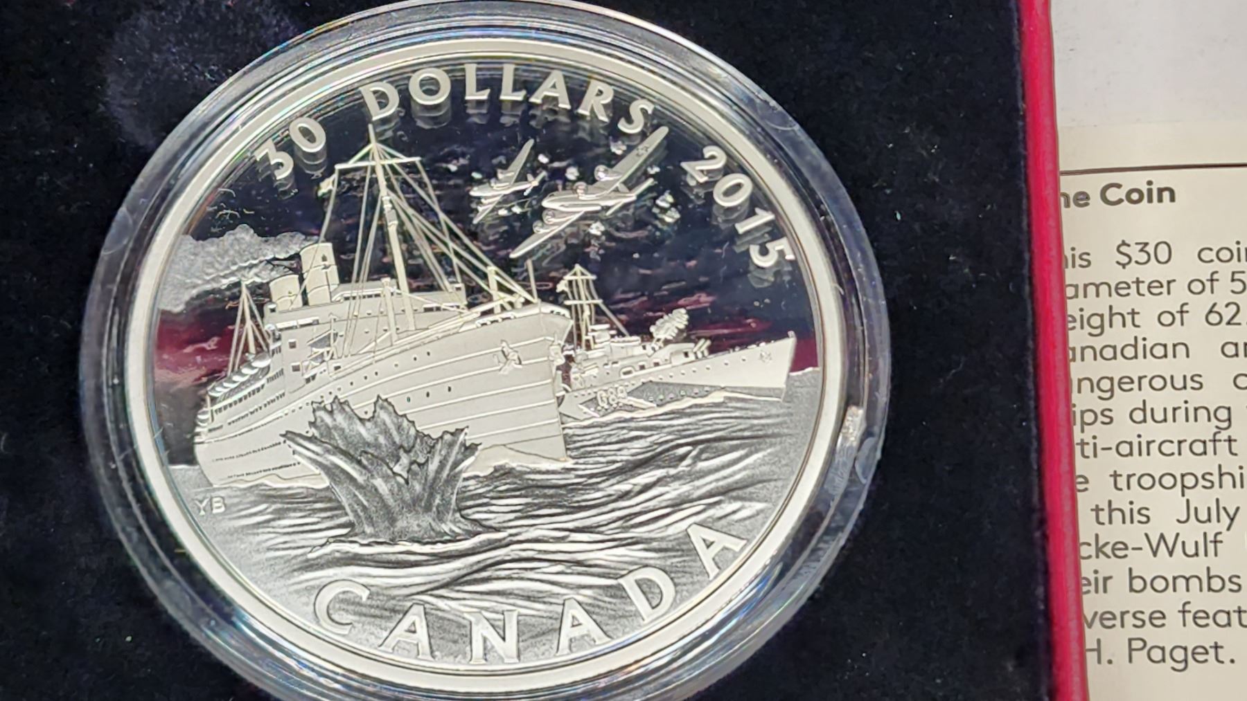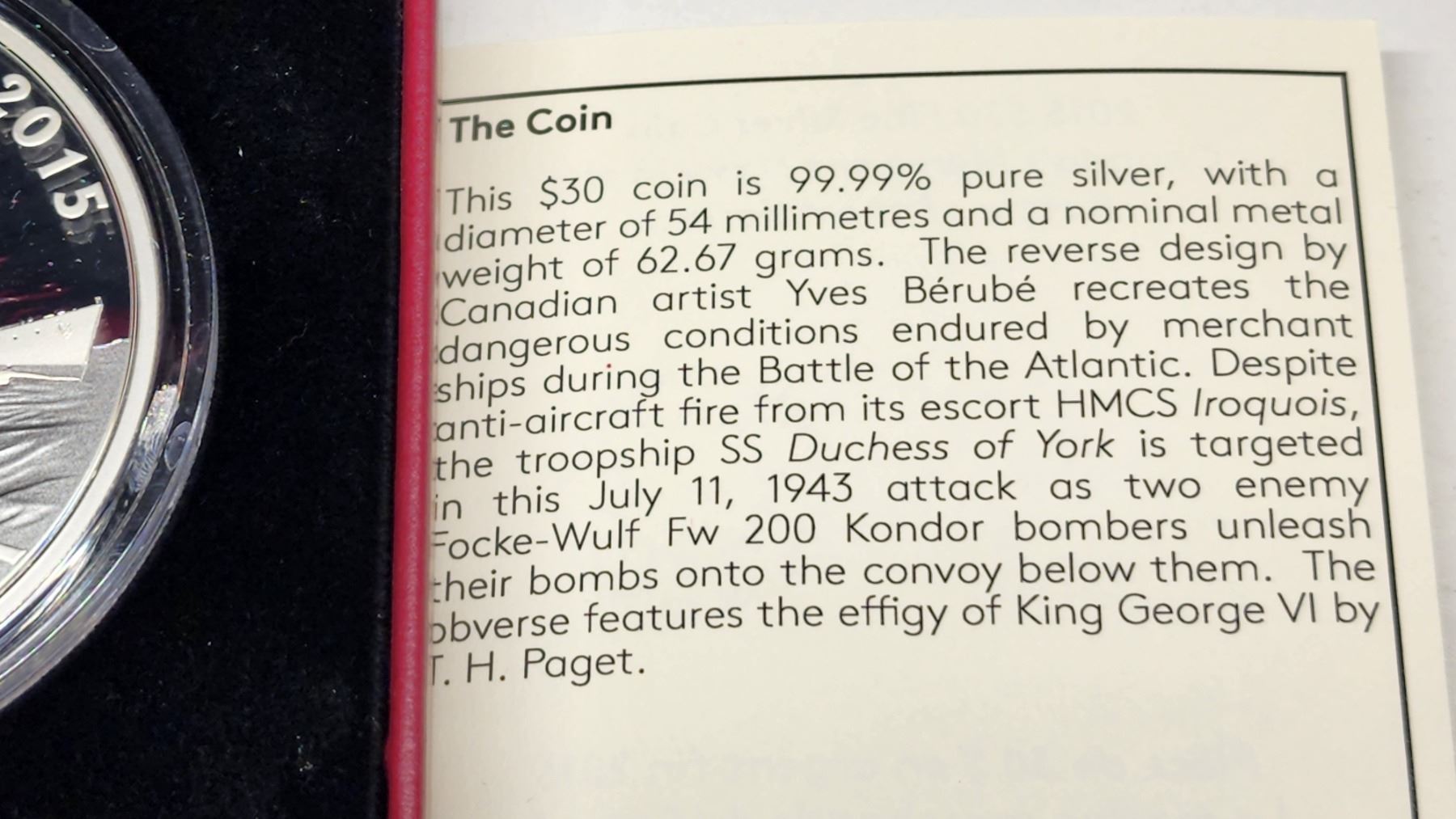 2015- $30.00 Silver RCM Coin - 62.67 grm - King George V1 effigy - BATTLE OF THE ATLANTIC - (Low mint #) #0793/5000