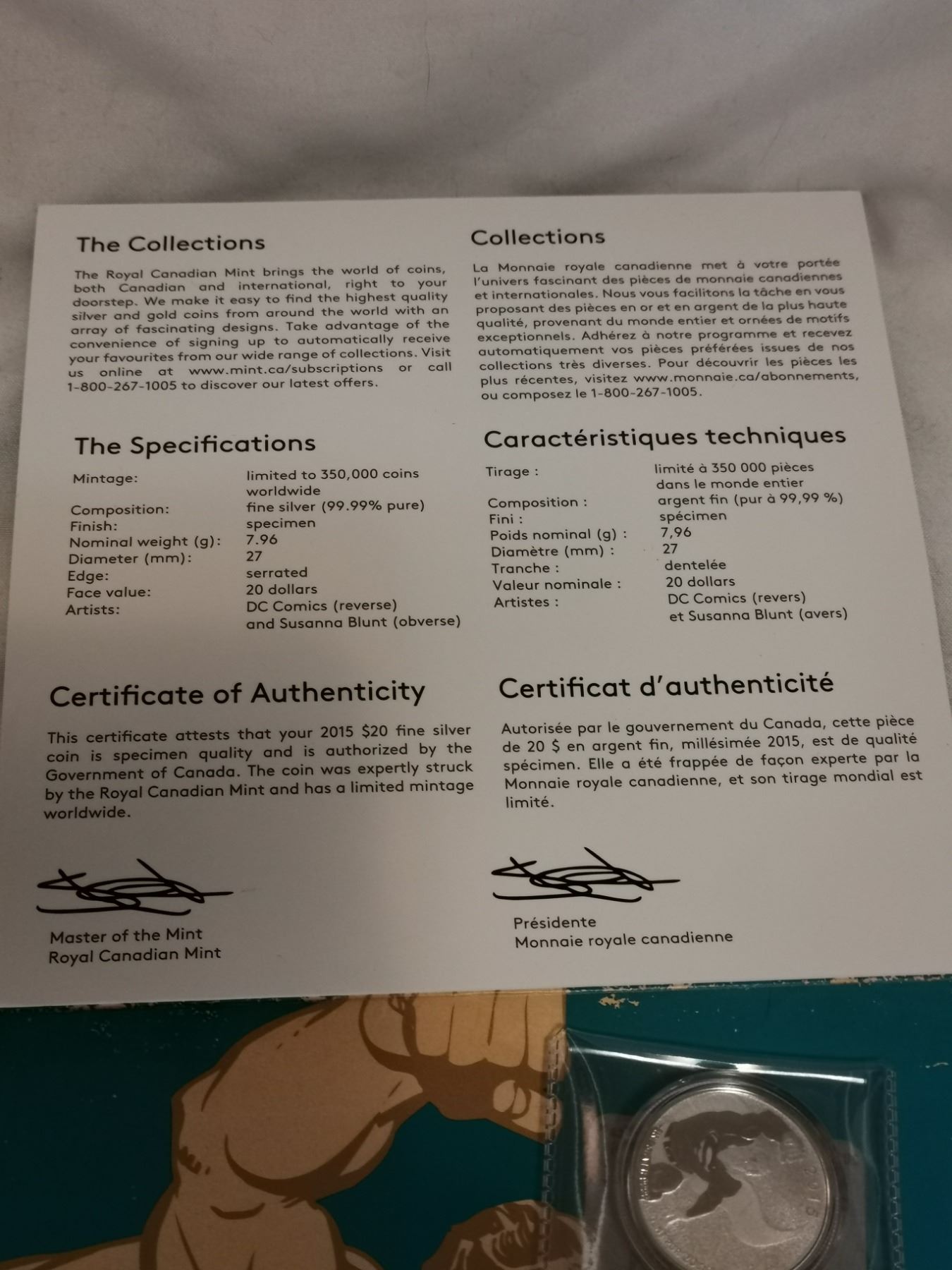 2015 Canada $20 Superman .999 Fine Silver Coin
