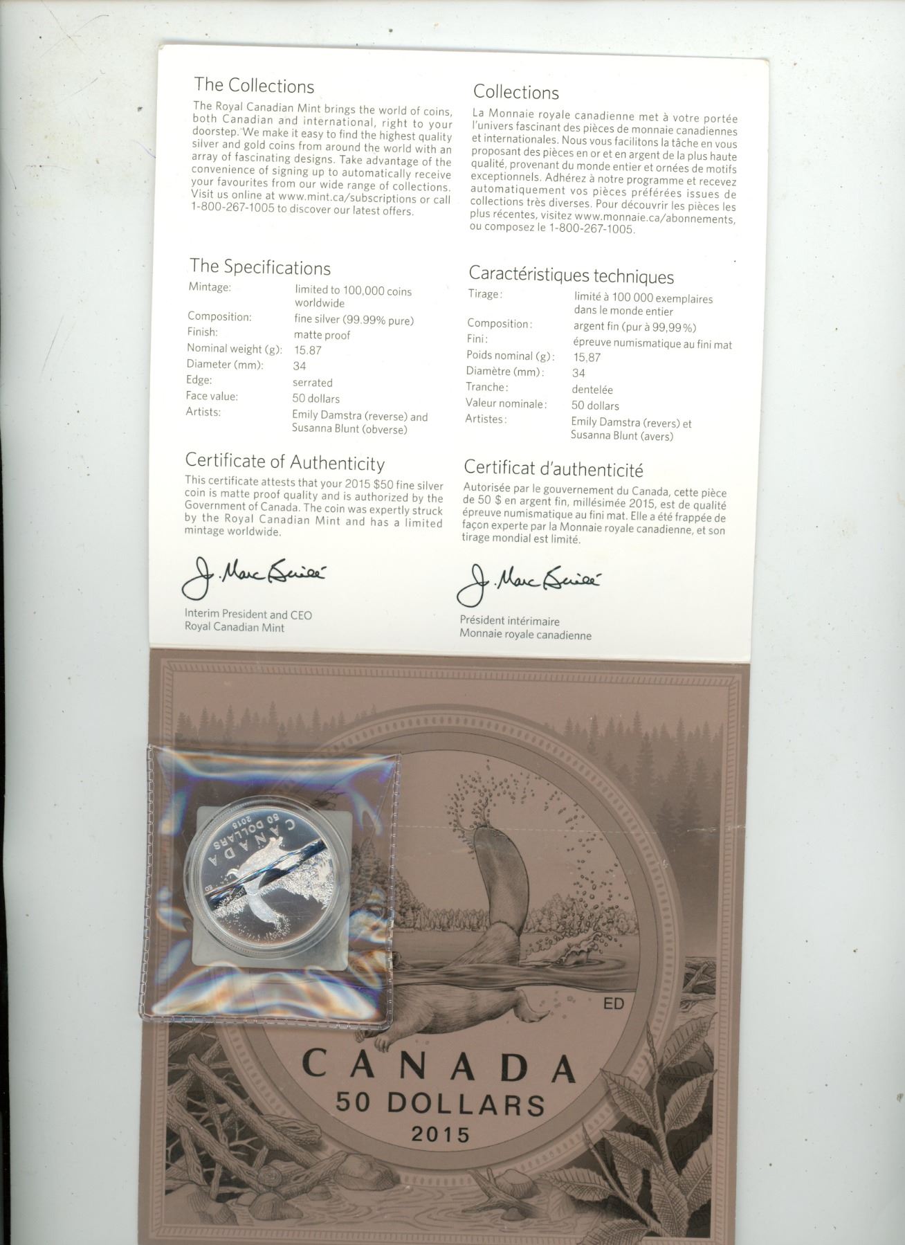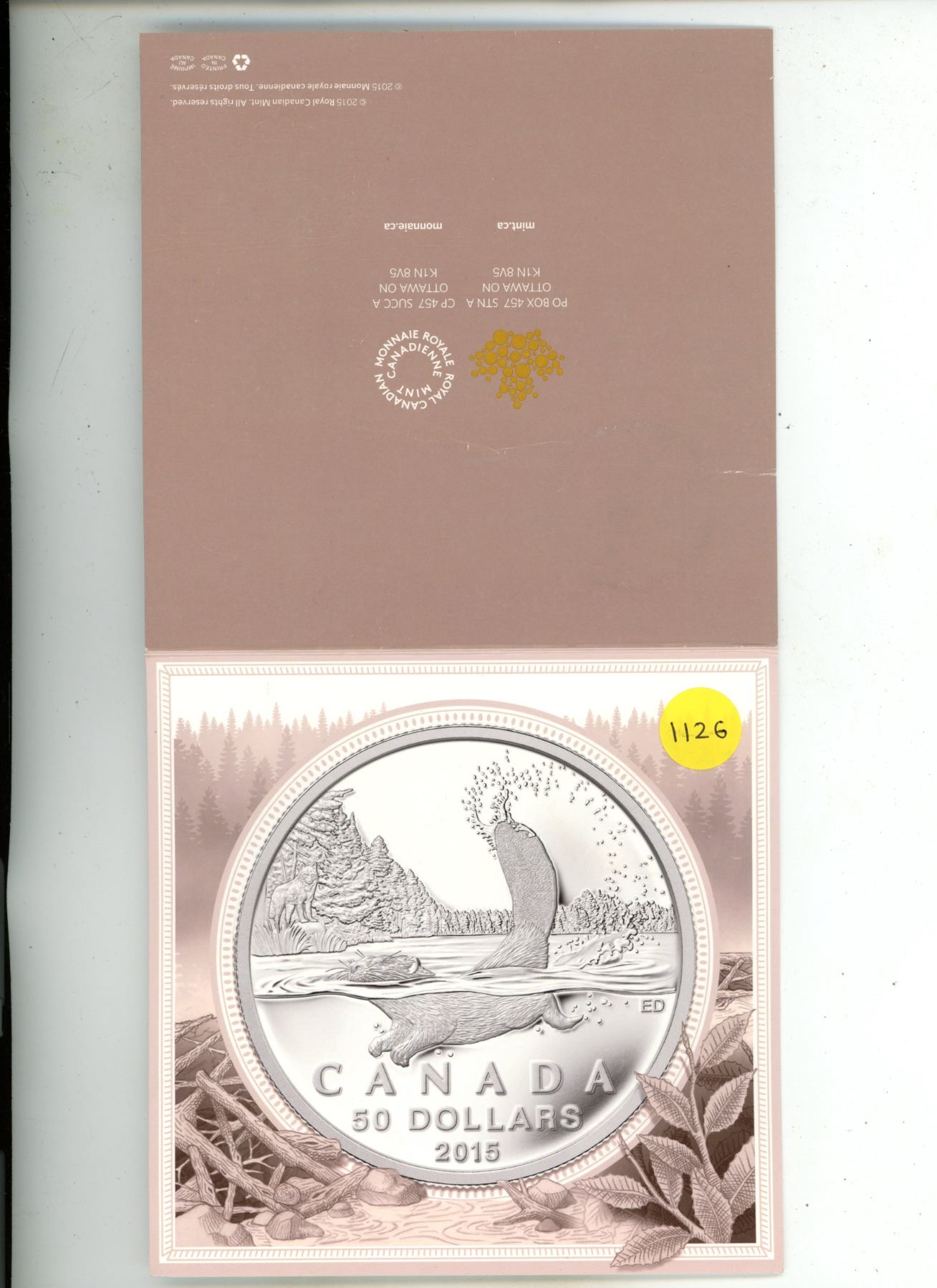 2015 Canada $50 Fine Silver Coin - Beaver.