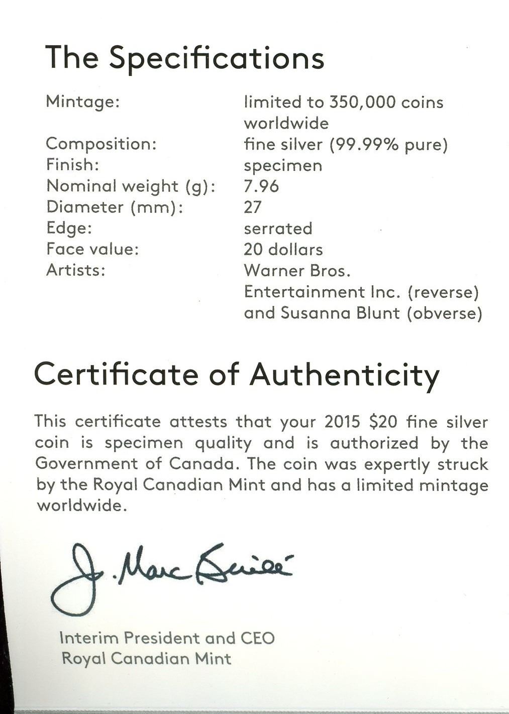 2015 Canadian Silver Coin Fine Silver Argent Purr 9999 20 Dollars (Bugs Bunny Design)