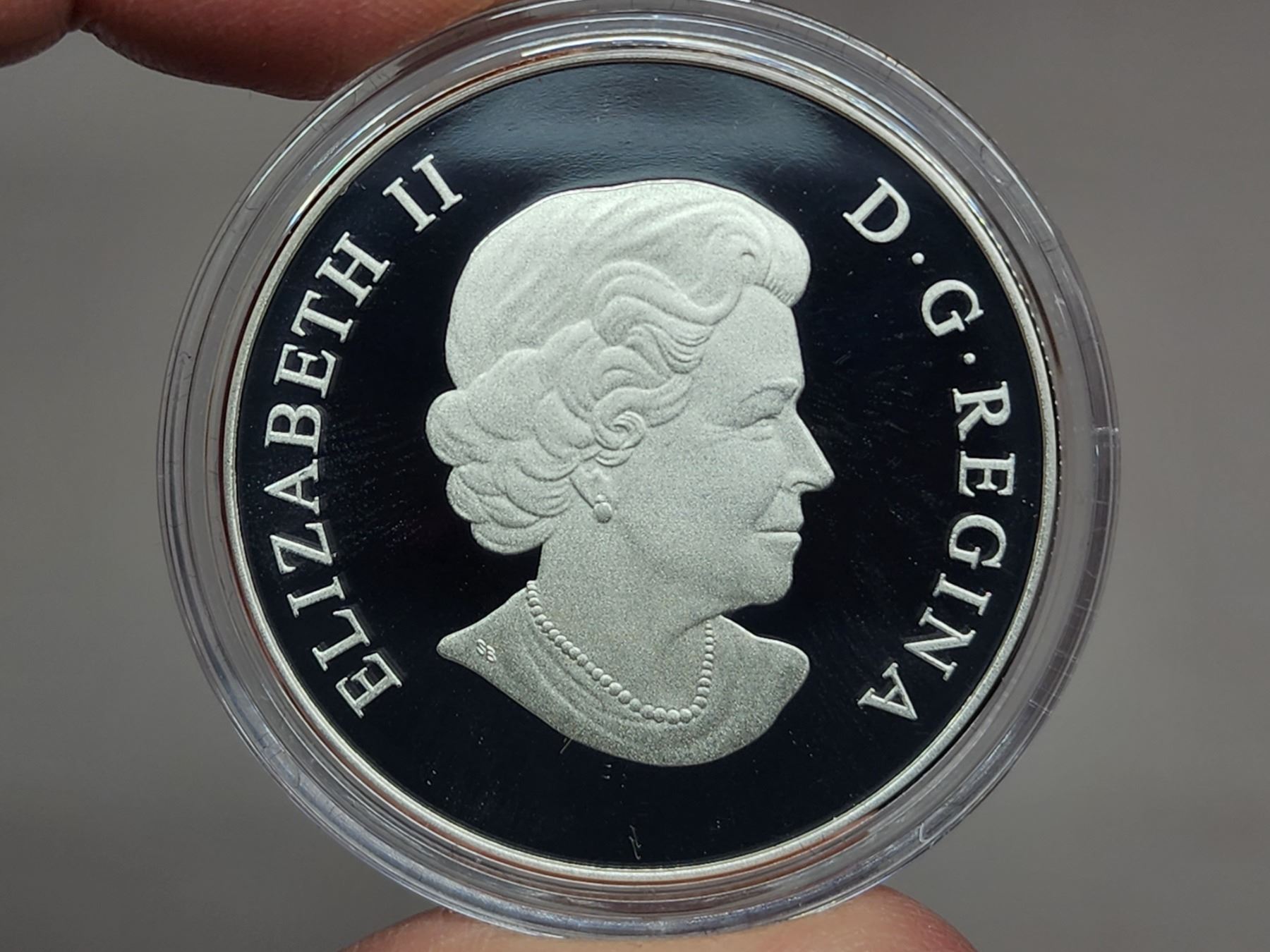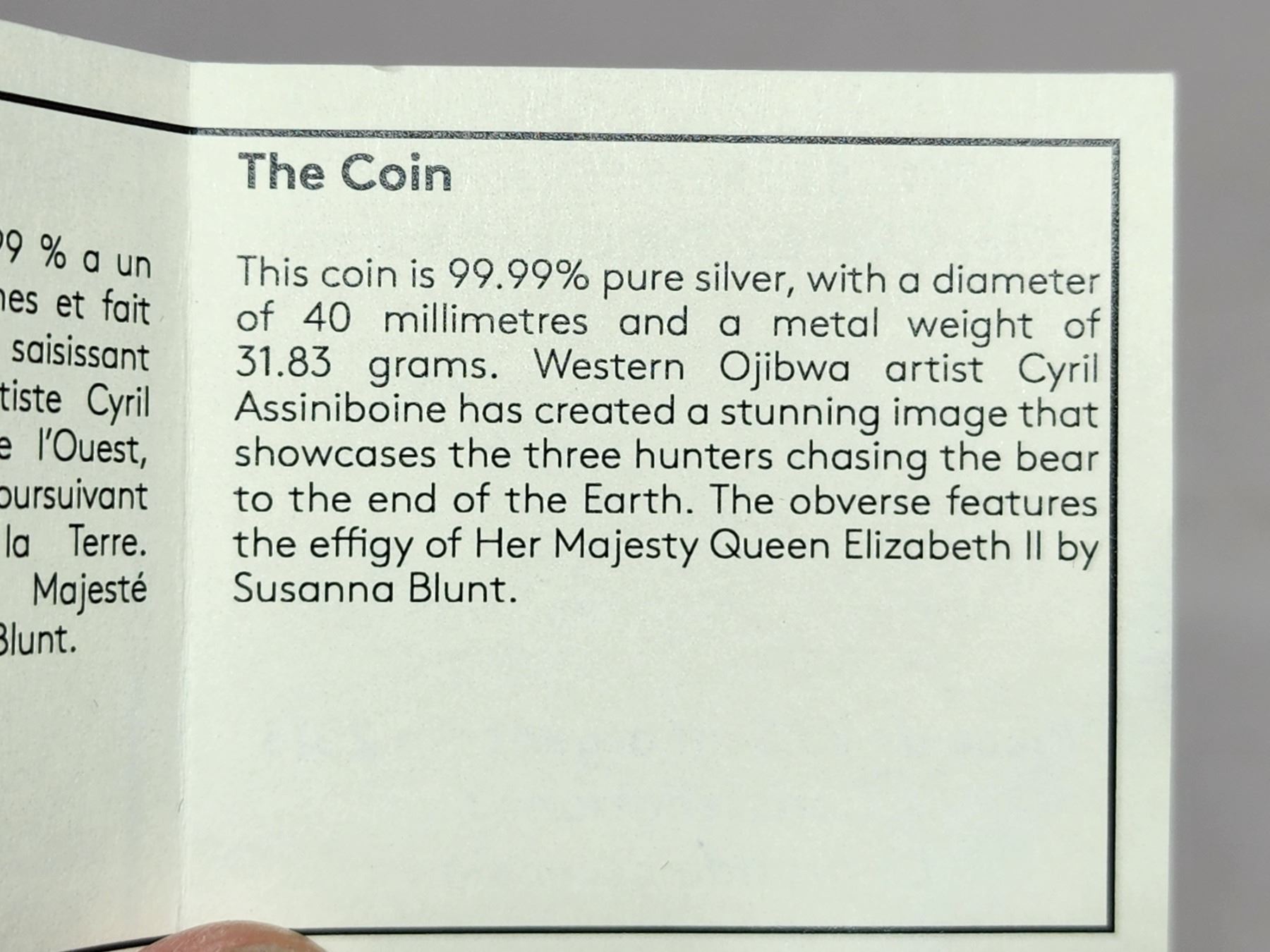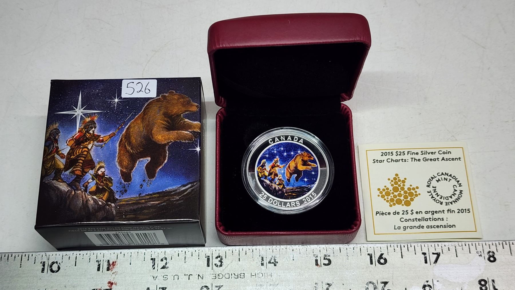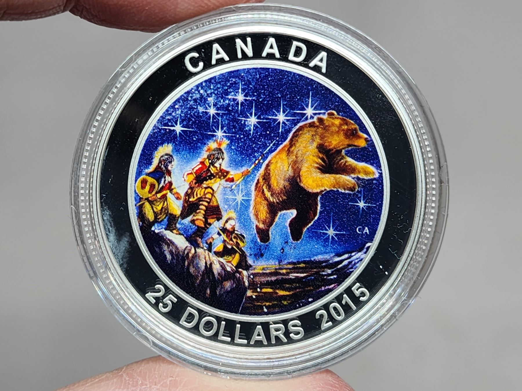 2015 Star Charts: The Great Ascent $25. Colourized image of 3 First Nations hunters chasing a bear to the end of the Earth. 99.99% pure Silver. Proof with Ultra Heavy Cameo. Housed in its original RCM case & box of issue.